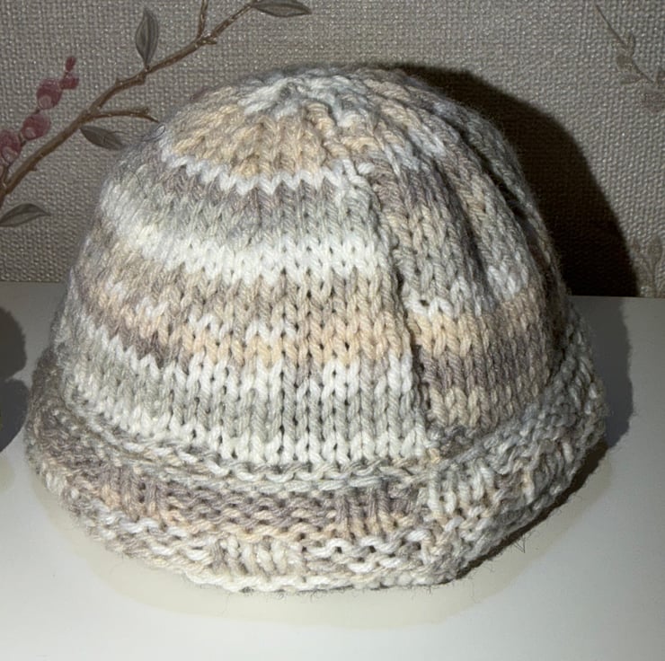The hat is knitted in beige mix double knitting weight yarn weight yarn.