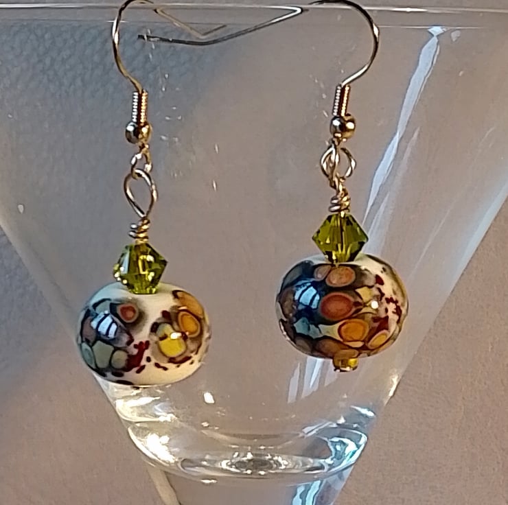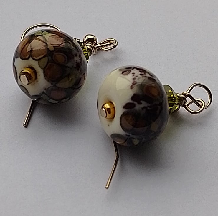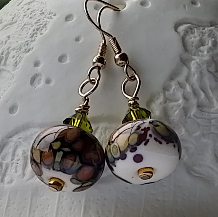 This is a pair of handmade drop earrings with glass lampwork beads in shades of brown and white with flecks of green. These beautiful art glass beads were handcrafted by a UK glassmaker and sit below a pretty olive-coloured Swarovski crystal.