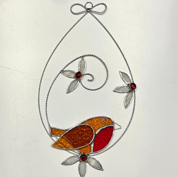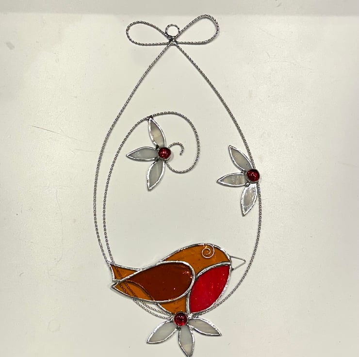 The glass used for the robin is an amber corella glass and a red stained glass for the red breast. I have used white wispy glass and red small nuggets for the flowers. Twisted tinned wire has been used for the robin to sit on.