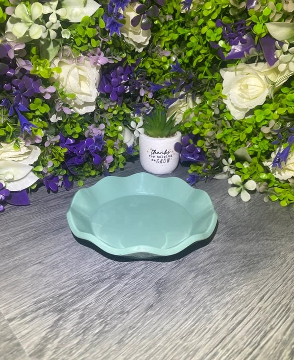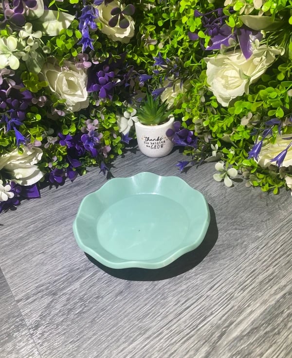 A handmade wavy dish in sage green. Approximately 13.5cm in diameter, perfect for jewellery, keys, chocolates, soap, you name it! Each piece is unique and comes gift-wrapped, perfect for gifting or treating yourself.