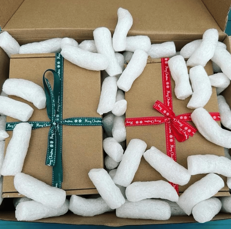 - Each gift box is carefully placed in a recyclable cardboard box, cushioned with eco-friendly packing peanuts.