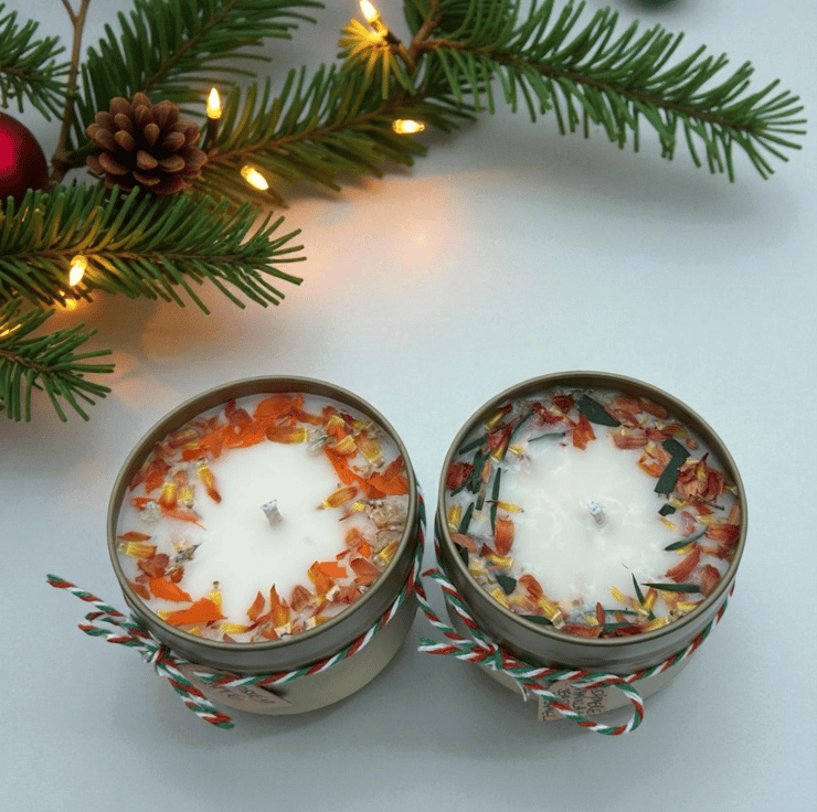 A festive gift set featuring two handmade soy candles wrapped with Christmas twine, accompanied by a glass bottle of matches with strike paper. All are nestled in soft shredded paper and beautifully boxed, finished with a Christmas ribbon for the perfect seasonal touch.