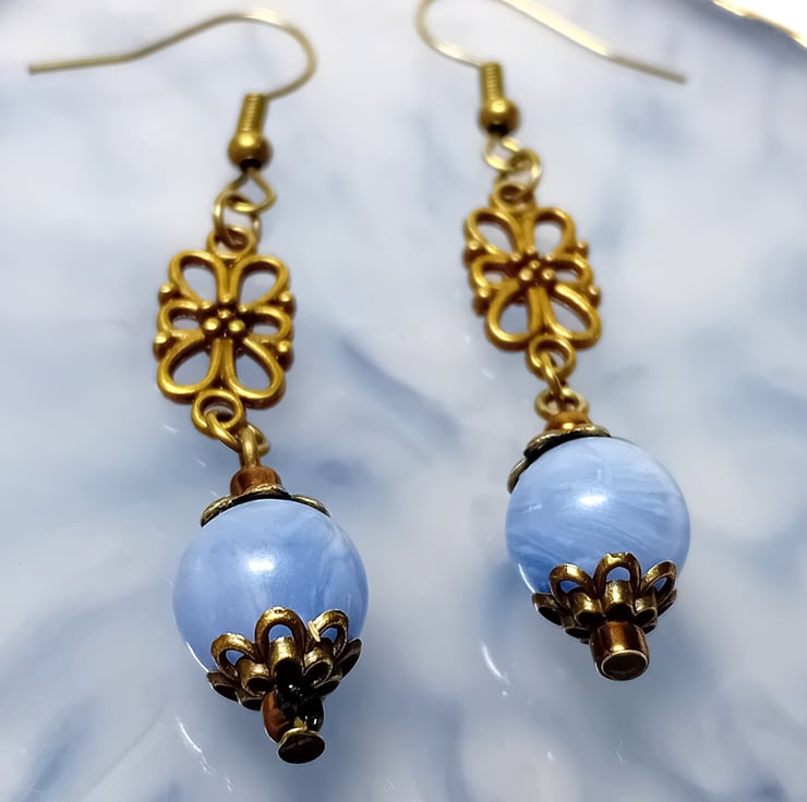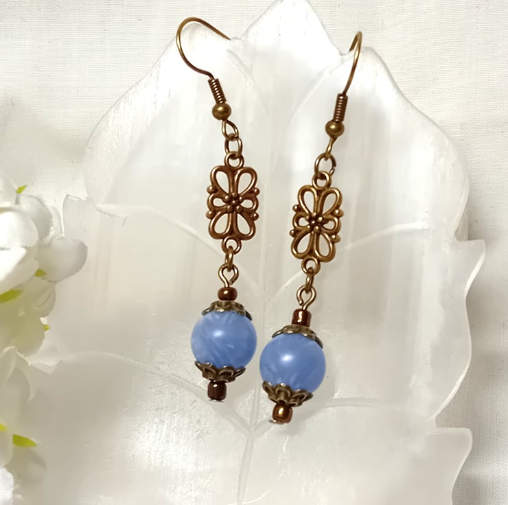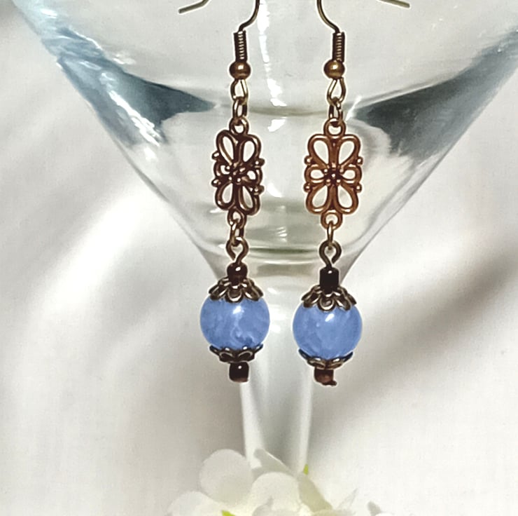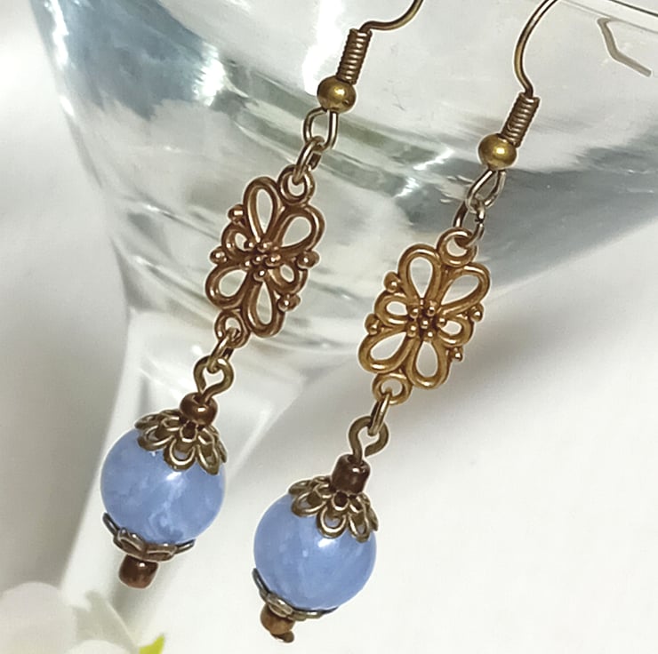 These stunning blue lace agate earrings feature 10mm gemstone beads, beautifully complemented by bronze accents and bronze fishhook ear wires. If you prefer, they can be customized with lever-back closures—simply select your preference from the drop-down menu. Each pair is carefully packaged for shipping and comes with an elegant organza gift bag.