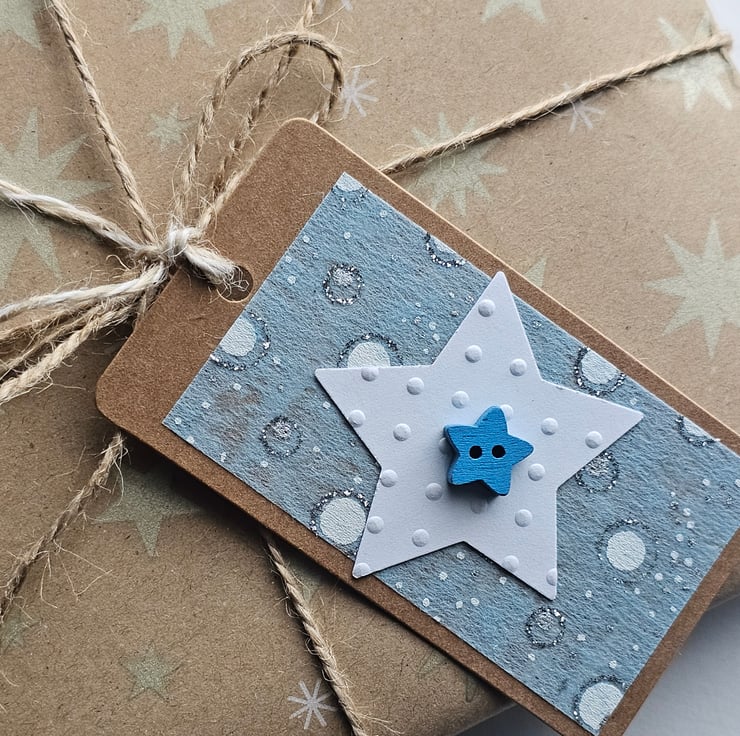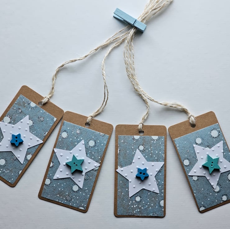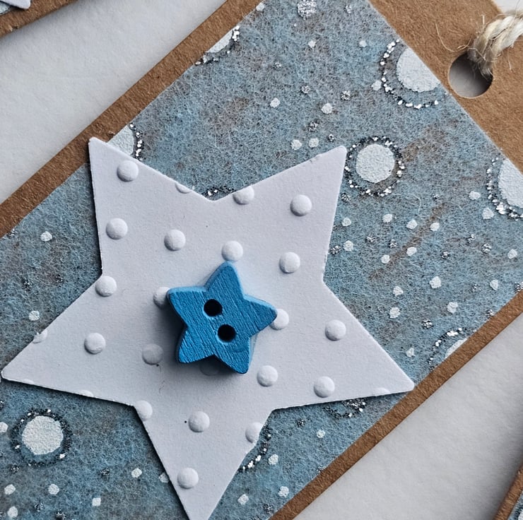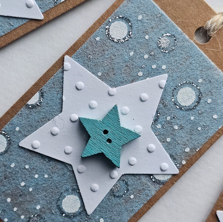 The tags are 9cm x 5 cm (3.5" x 2"). The materials used are: brown kraft labels, special patterned paper, white embossed card star shapes, wooden star buttons and twine.