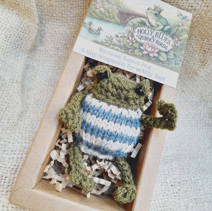 This is Wilbur, a calm and steady emotional support frog with a cosy blue striped belly. Wilbur is the thoughtful sort - a little frog who sits quietly by, keeping you company on long days and offering soft reassurance on days when things feel uncertain.