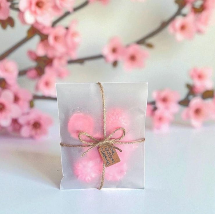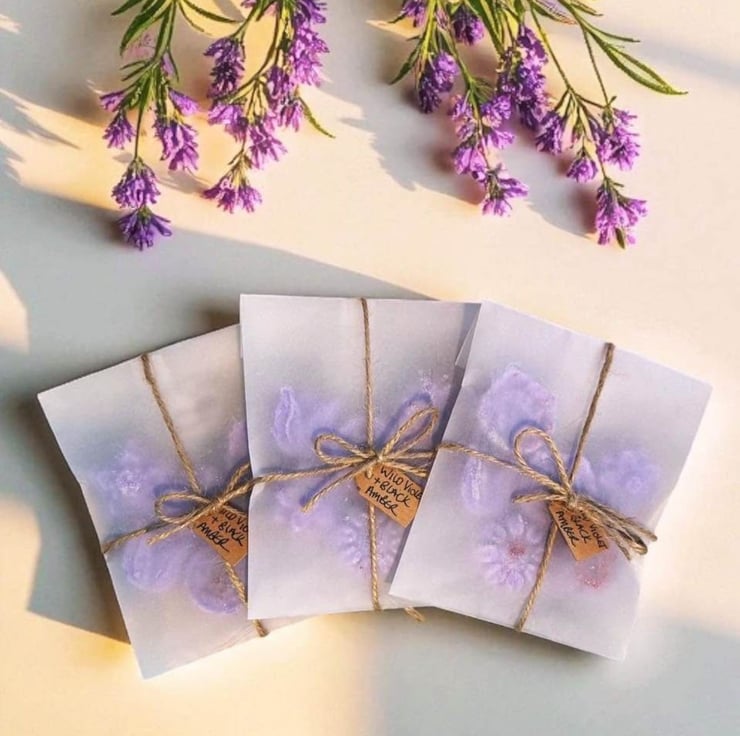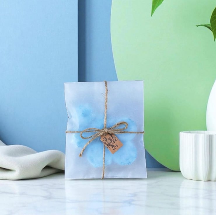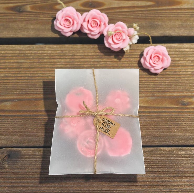 A glassine bag featuring 6 handmade flower shaped soy wax melts wrapped with twine and fragrance tag.