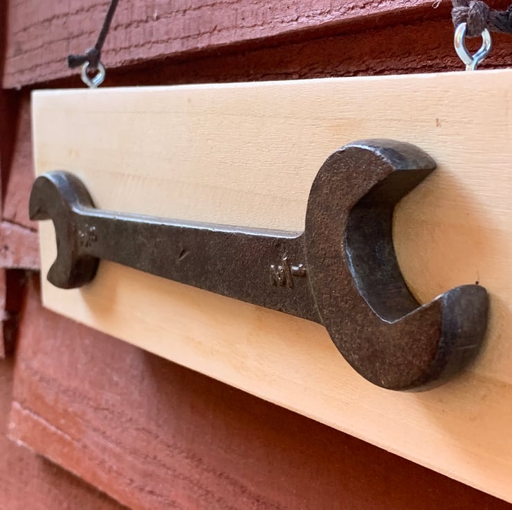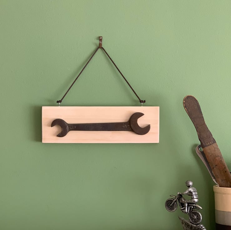 Every plaque made will have a different spanner and reclaimed wooden base to match.