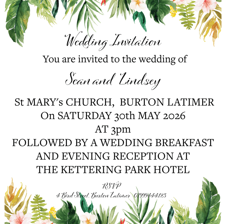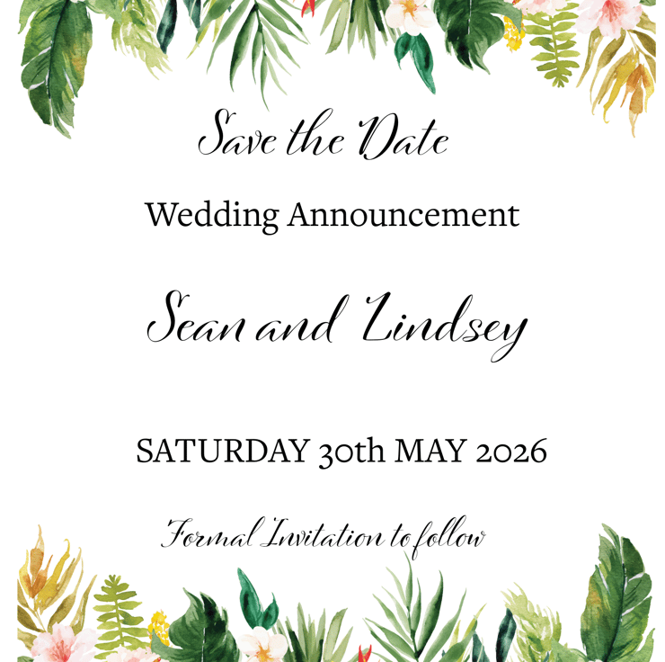 Bring a touch of vibrant tropical elegance to your wedding with this beautifully coordinated stationery set, featuring lush watercolour florals in rich greens, pinks and yellows. Each design includes matching Save the Date cards, full Wedding Invitations and Wedding Details cards, all created in the same eye-catching botanical theme. The text is professionally laid out with a soft script paired with classic serif lettering for a polished and romantic finish. Perfect for spring and summer weddings, destination themes or anyone who loves colourful botanical style. These cards are ideal for sending to family and friends to set the tone for your special day, with custom wording available to suit your needs.