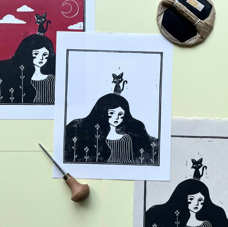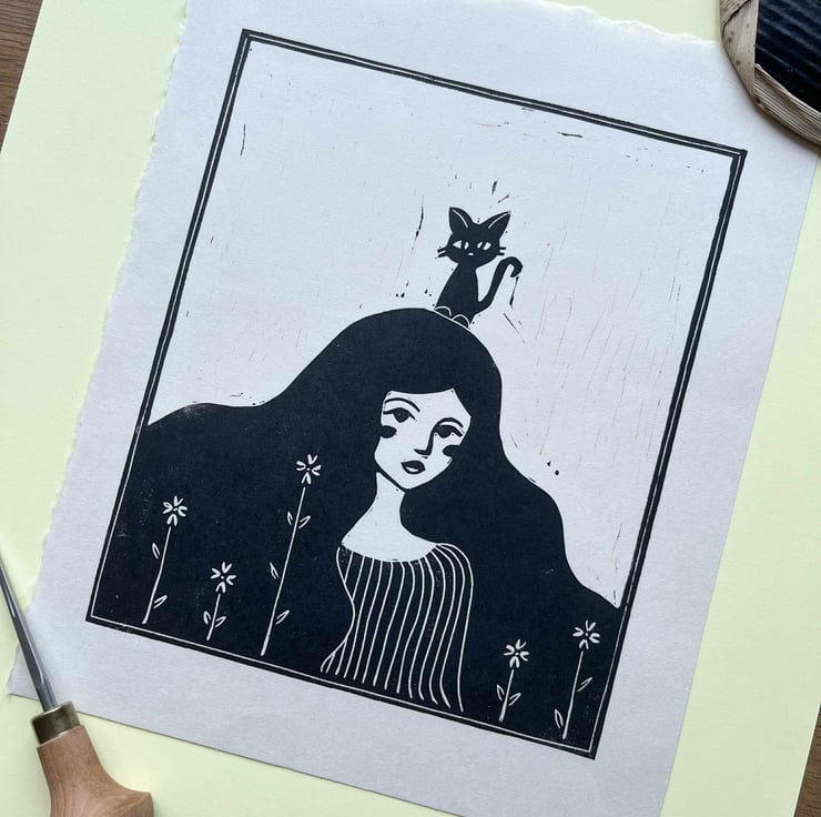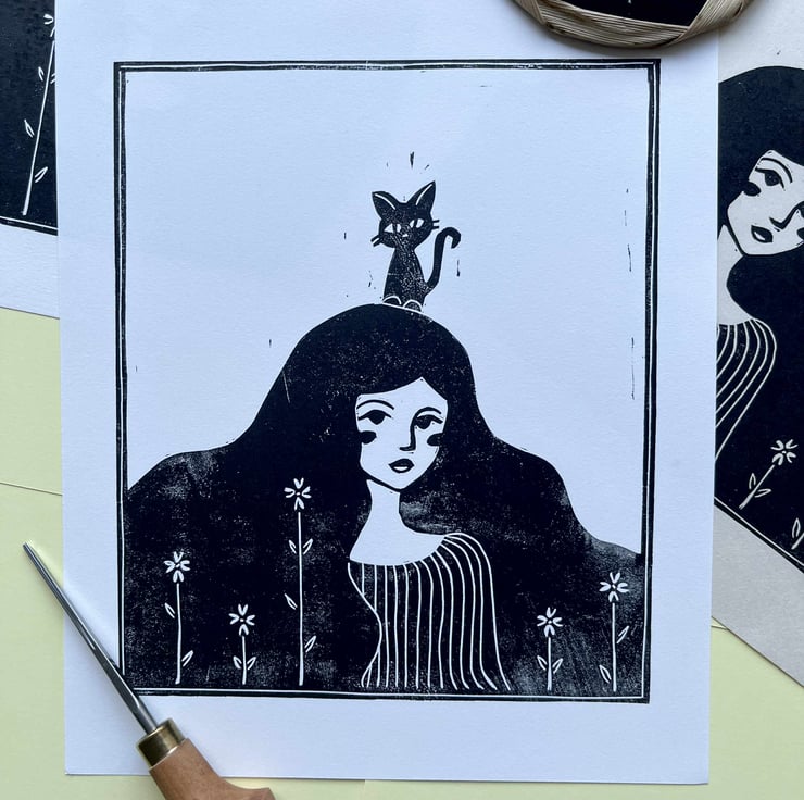 "Cat Lady" original linocut print is made for those who has a gentle soul. Hand printed on white printmaking paper, the print adds a touch of whimsy and cosiness to your space and is perfect as a gift for anyone who resonates with a gentle quiet nature and appreciates handmade art.