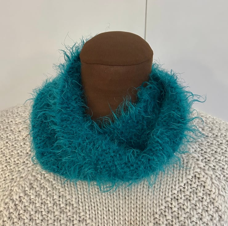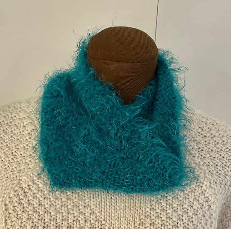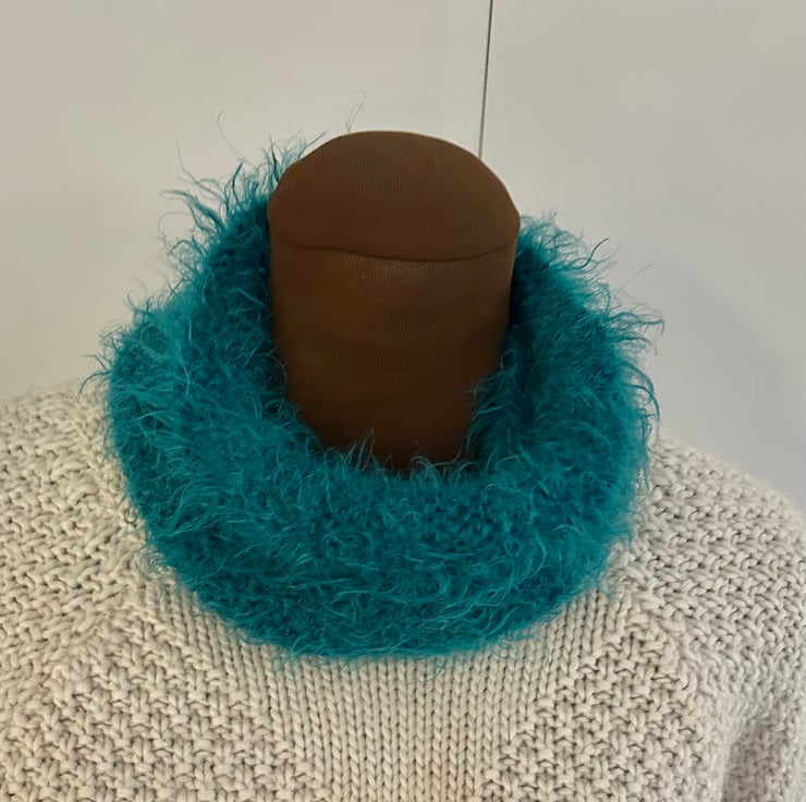 Super soft, knitted in teal Lussuria fluffy yarn, it measures 51cm/20” round and is nice and stretchy. Wear it flat or folded, tucked in or left out. It is very warm and cosy. Yarn is 81% nylon and 19% courtelle and can be cool machine washed,