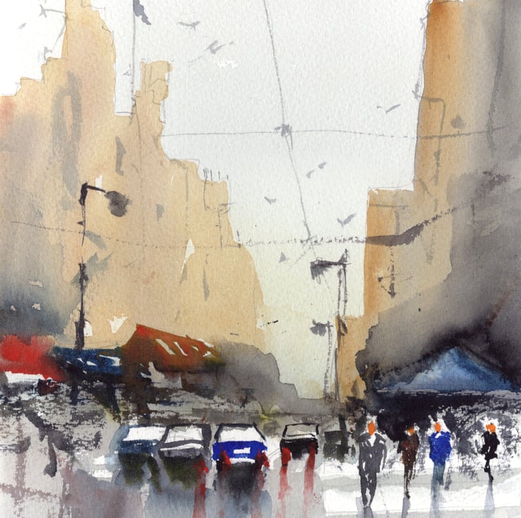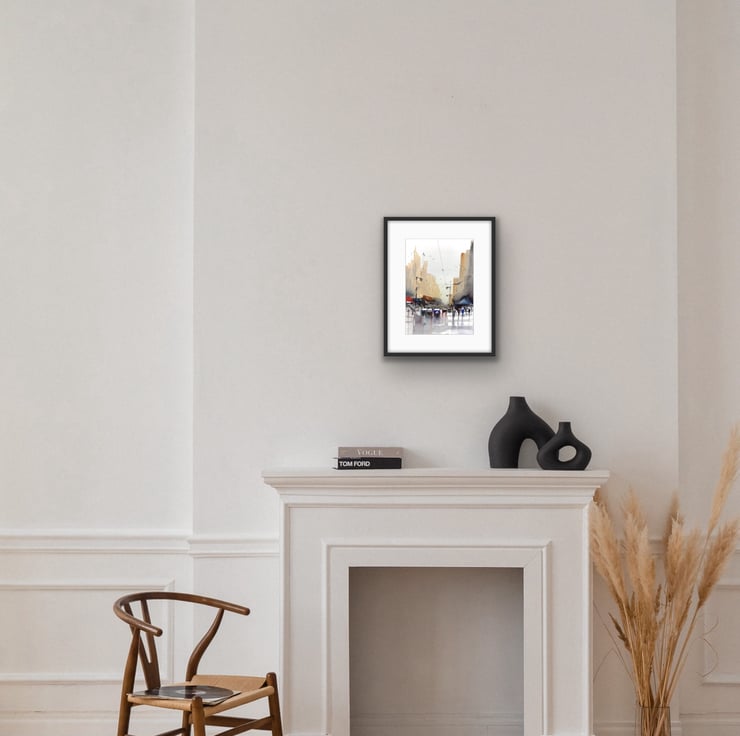 Painted by me using the best watercolours on thick, high-quality watercolour paper, this atmospheric cityscape captures the movement, mood, and energy of a rainy urban day. Its loose, expressive brushwork and soft, glowing palette give it a timeless, contemporary feel that suits any décor. Measuring approximately 8 x 11 inches (A4 at least), this original signed artwork is offered unframed, allowing you to choose a frame that perfectly matches your space. A unique piece of art that brings both elegance and character to any room.