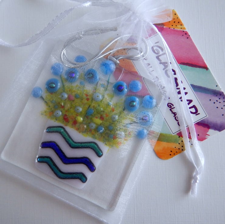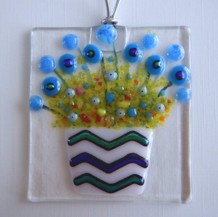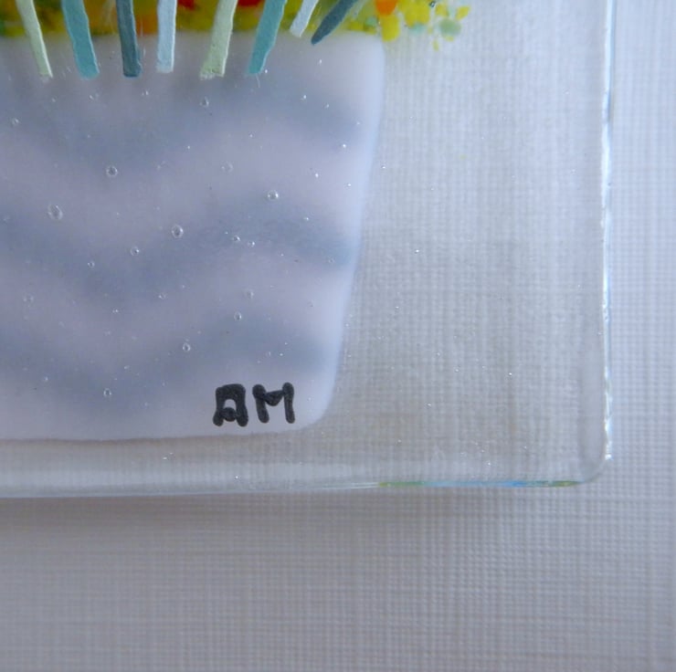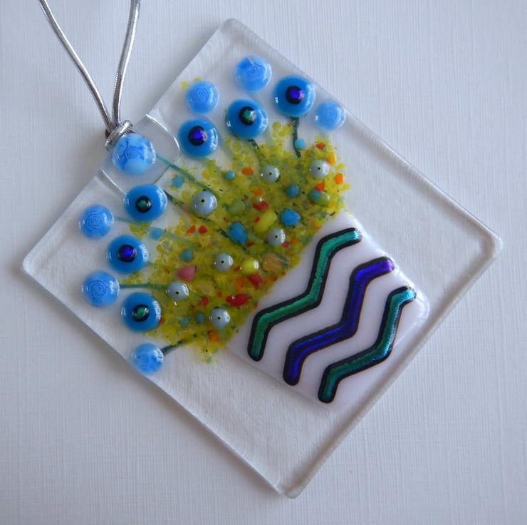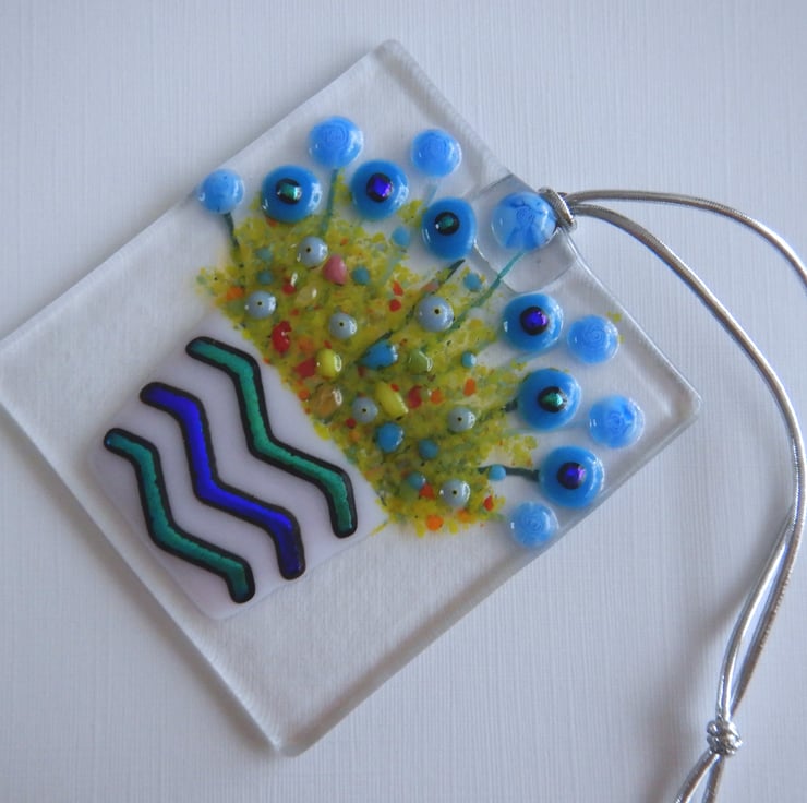 It started off being a simple sheet of transparent fusing glass. The flowers and details were then added using a combination of coloured sheet glass, frit glass, dichroic glass, millefiori beads, and glassline powder.