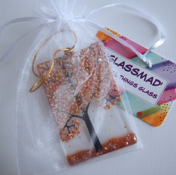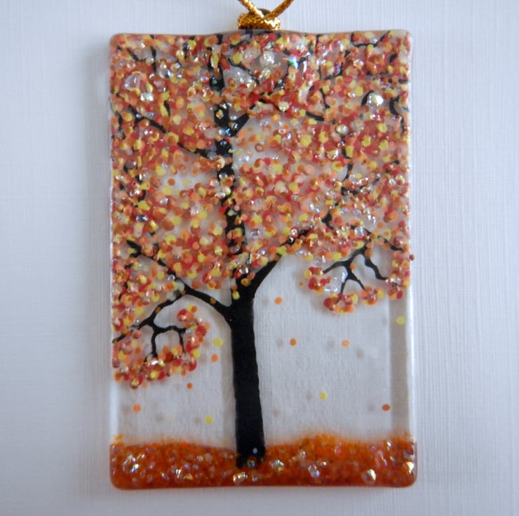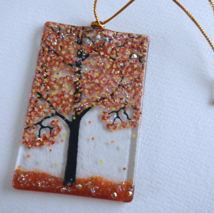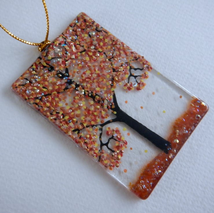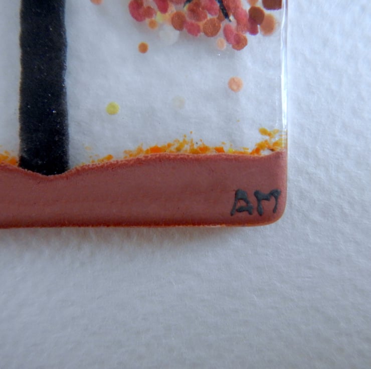 It started off being a simple sheet of transparent fusing glass. The Tree and details were then added using a combination of, frit glass, dichroic glass, and glassline powder.