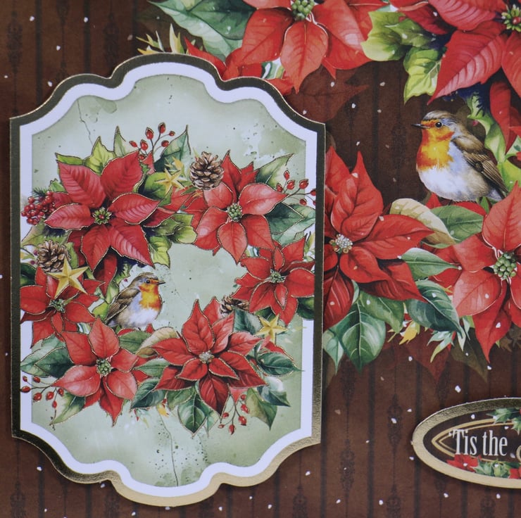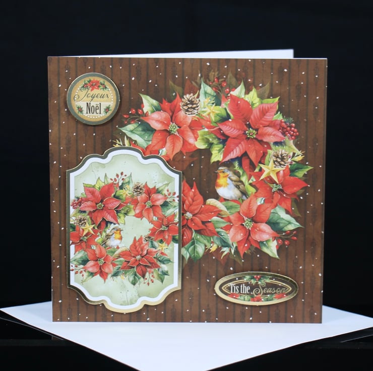 A delightful gold rimmed and gold highlighted topper of a robin sitting in a wreath of poinsettias, ivy, berries and fir cones, layered onto matching backing card. The two matching gold rimmed toppers read 'Joyeux Noel' and 'Tis the Season'