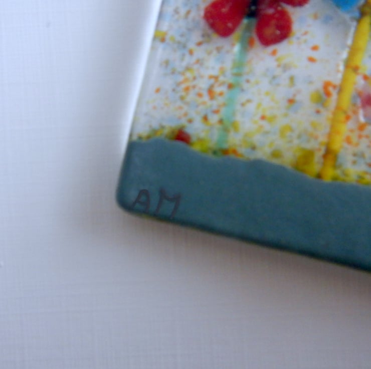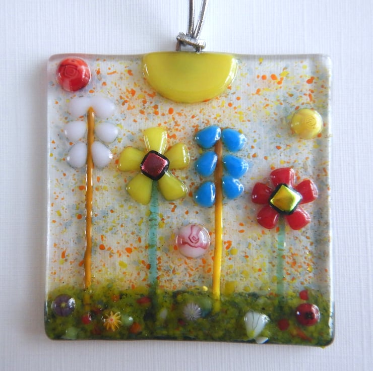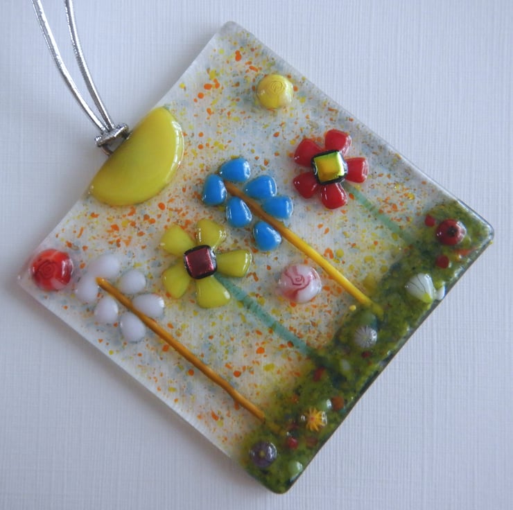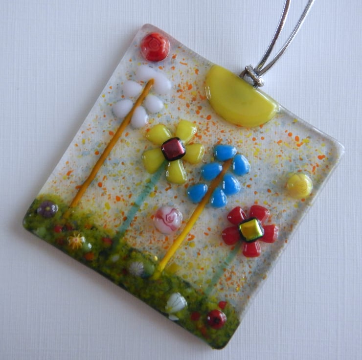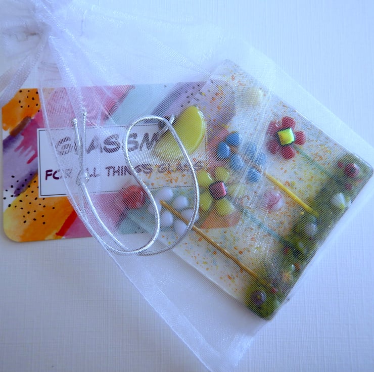 It started off being a simple sheet of transparent fusing glass. The flowers and details were then added using a combination of coloured sheet glass, frit glass, dichroic glass, millefiori beads, and glassline powder.