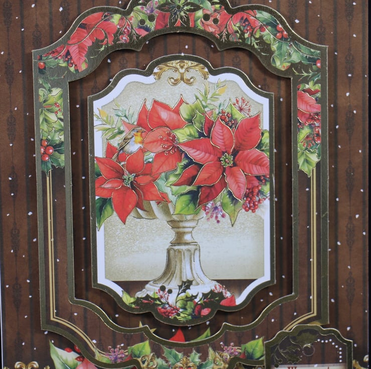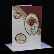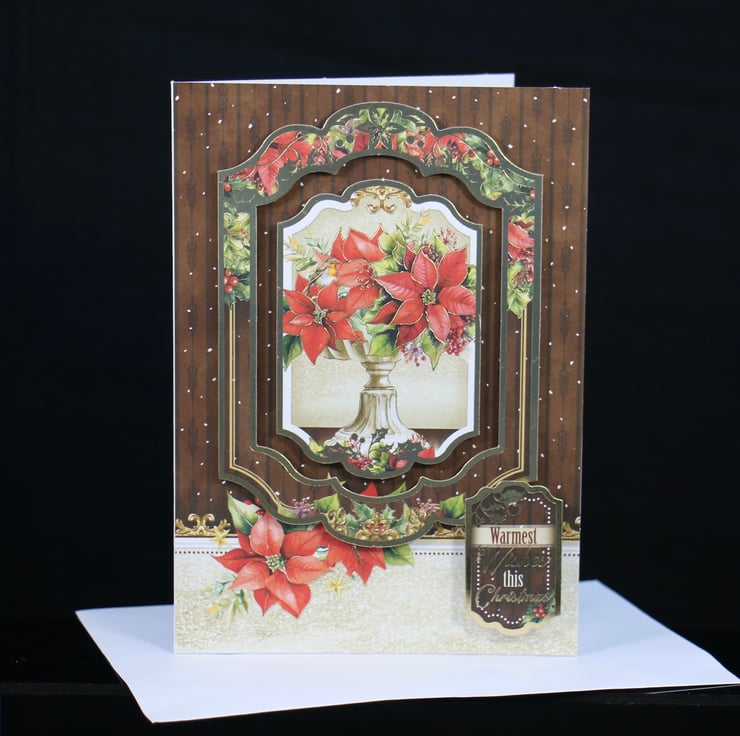 An attractive gold rimmed and gold highlighted topper of a robin sitting amongst a collection of poinsettias, and layered onto matching backing card. The gold rimmed sentiment reads 'Warmest Wishes this Christmas'