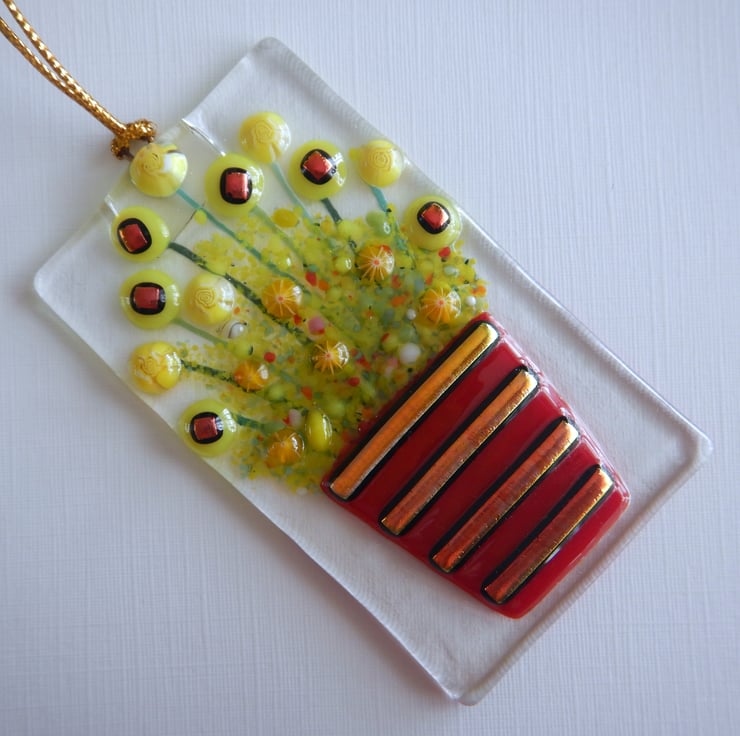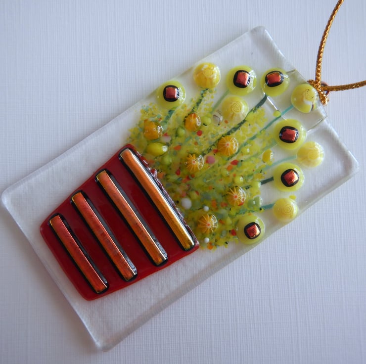 It started off being a simple sheet of transparent fusing glass. The flowers and details were then added using a combination of coloured sheet glass, frit glass, dichroic glass, millefiori beads, and glassline powder.