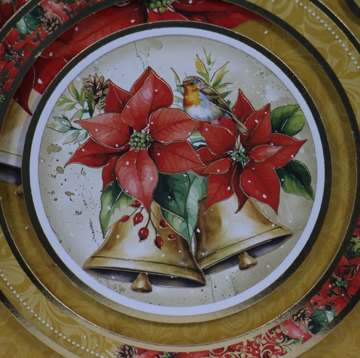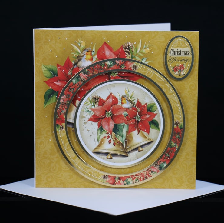 A round gold rimmed and highlighted topper of a robin sitting among poinsettias on top of two bells and layered onto matching backing card. The gold rimmed sentiment reads 'Christmas Blessings'
