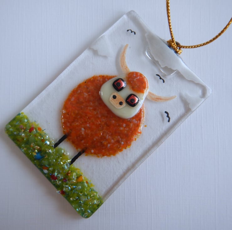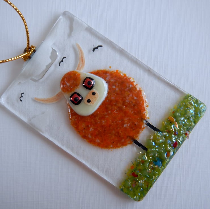 It started off being a simple sheet of transparent fusing glass. The Cow and details were then added using a combination of, sheet glass, frit glass, dichroic glass, and glassline powder.