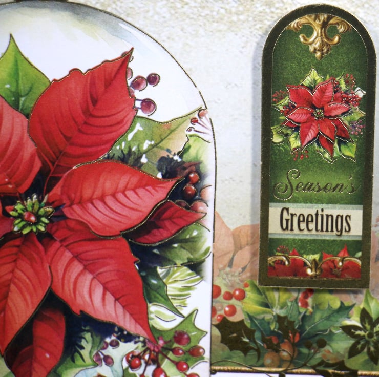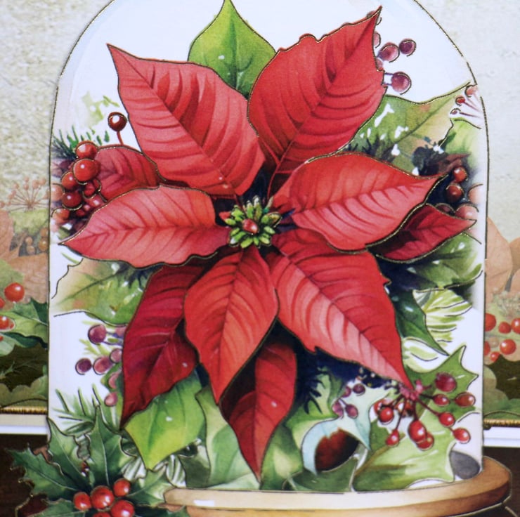 A beautiful poinsettia inside a bell jar, with gold highlights and holly and berries. The matching gold rimmed and highlighted sentiment reads 'Season's Greetings'