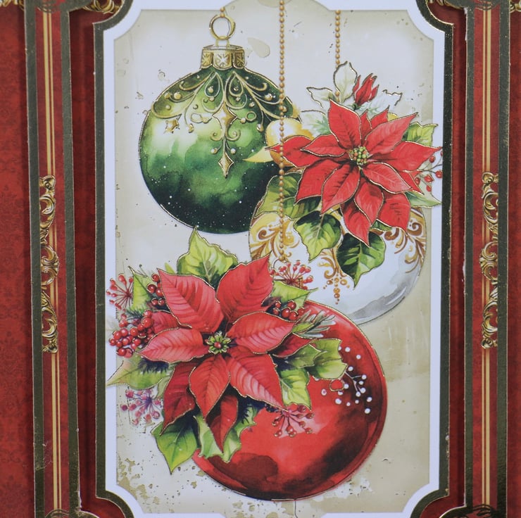 A gold rimmed and gold highlighted topper of decorated baubles, plus poinsettias, ivy and berries. Layered onto matching backing card.