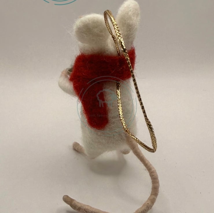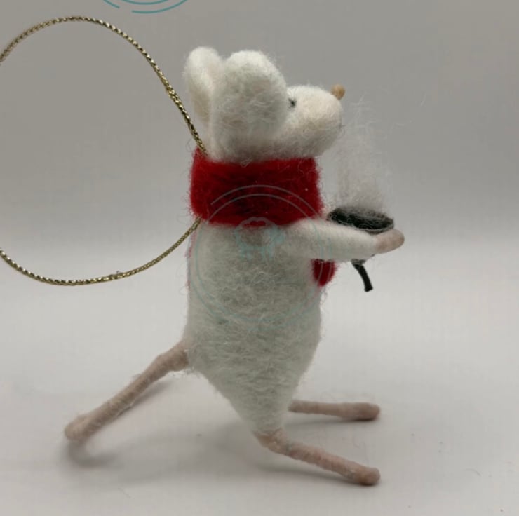 This beautiful little white mouse wears a red scarf and carries a tiny acorn mug of steaming hot chocolate. He can both stand and / or act as a hanging decoration. A wonderful addition to any tree, wreath or decorative space.