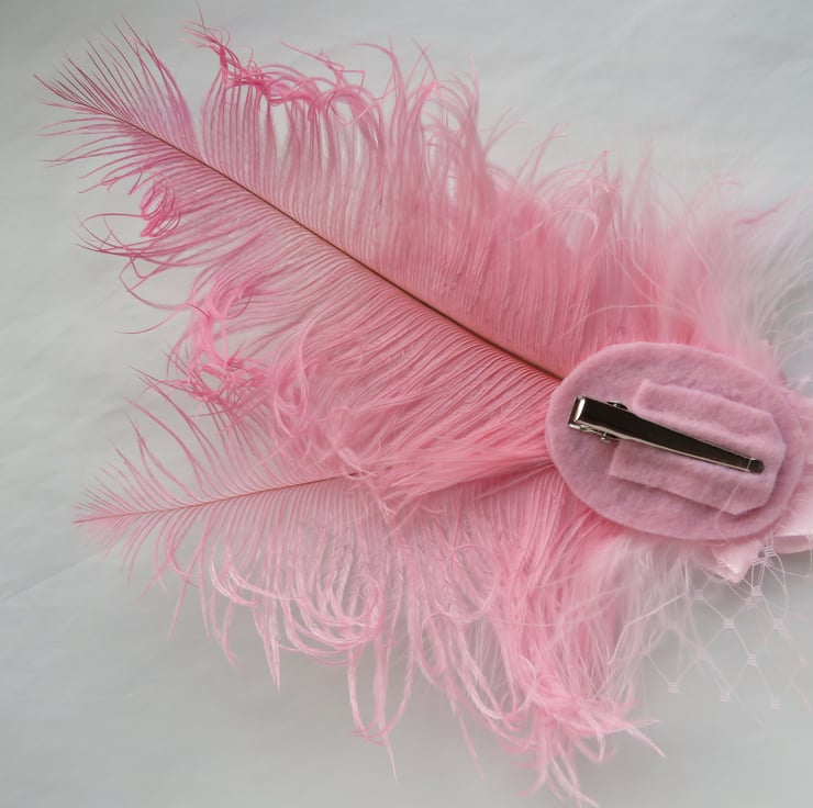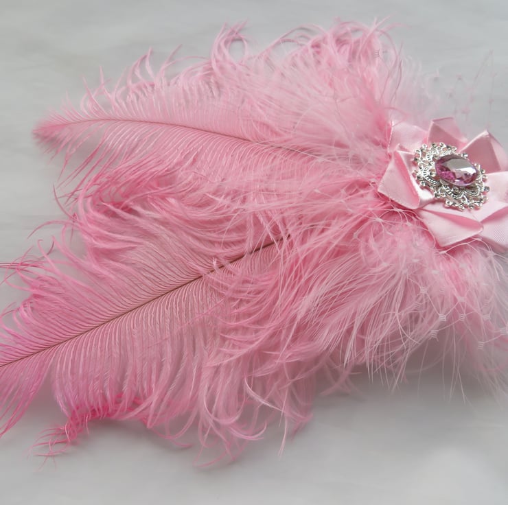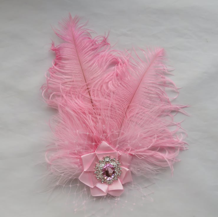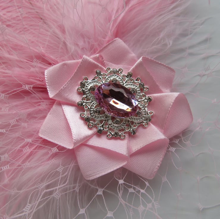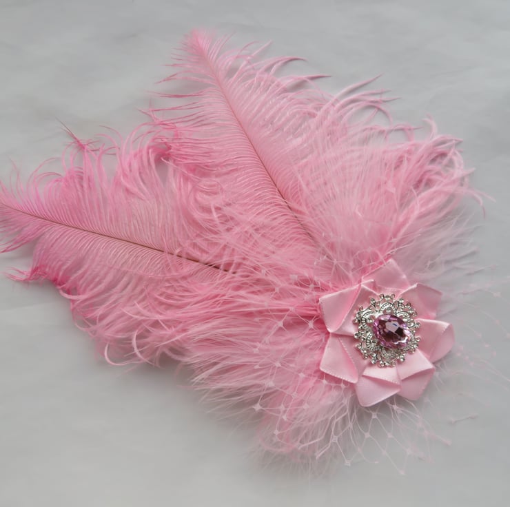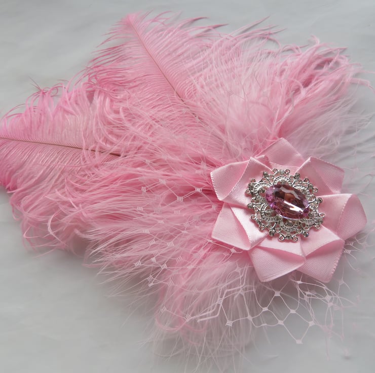 Created with two pale candy pink curled ostrich feathers with pale pink fluff feathers, a puff of pale pink veiling with a pale pink satin ribbon with a beautiful sparkly rose pink crystal and diamante silver antique style cabochon.