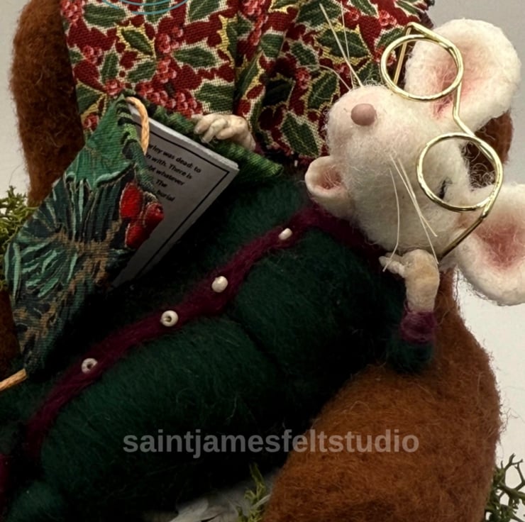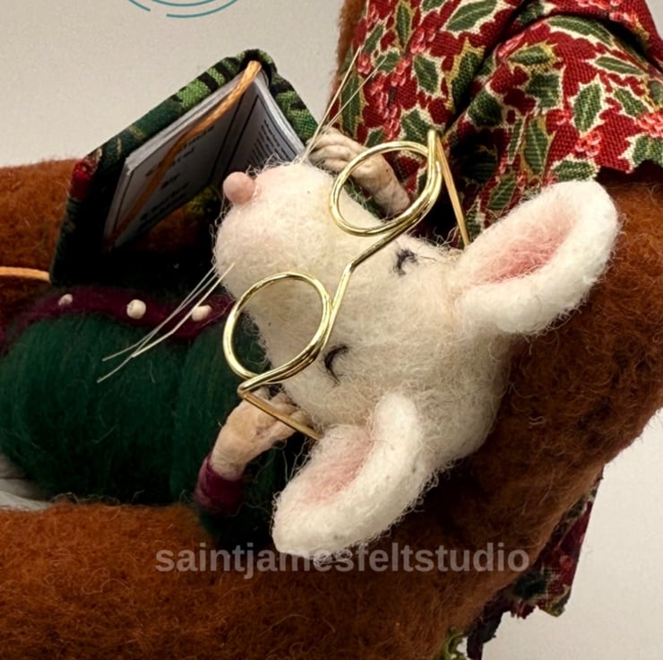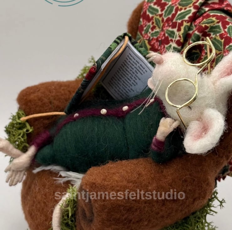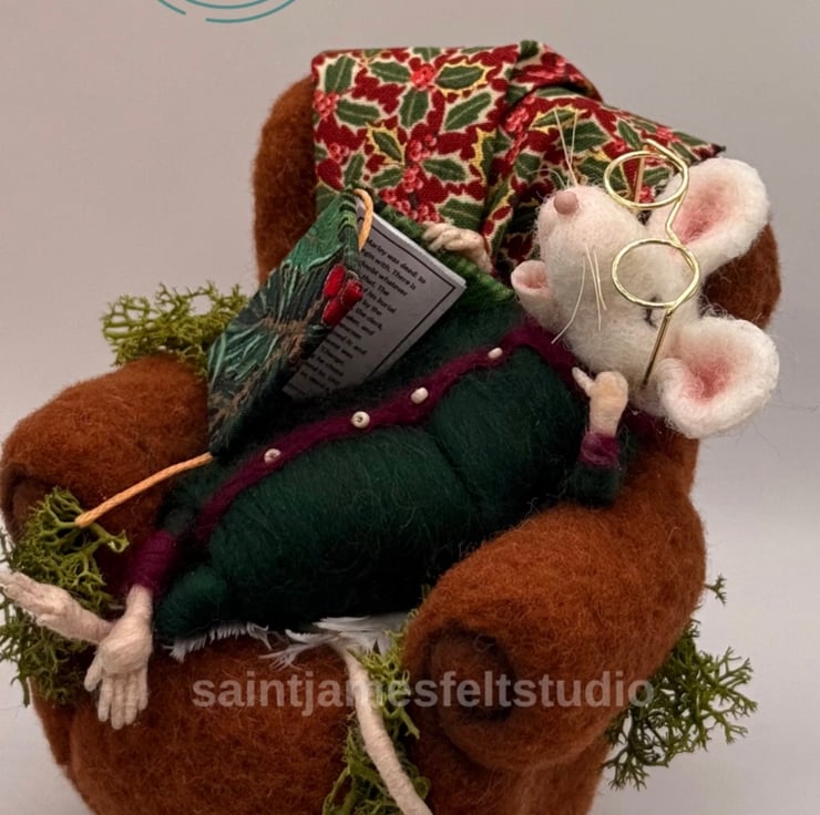 This beautiful little needle felted mouse sits fast asleep in a needle felted armchair, with his glasses slightly askew, part way through a Dickensian novel. The serene little fellow would make a wonderful addition to any home as an ornament.