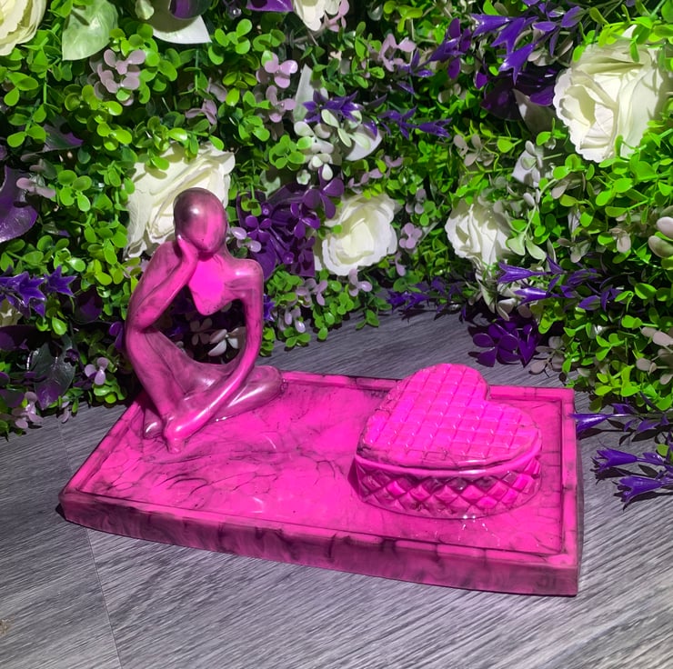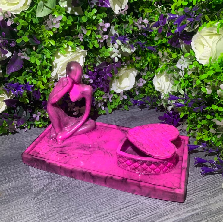 A handmade large rectangular tray, thinking person and heart trinket pot in hot pink and black. Approximately 24.1cm x 12.1cm x 14.8cm in size, perfect for jewellery, keys, chocolates, you name it! Each piece is unique and comes gift-wrapped, perfect for gifting or treating yourself.