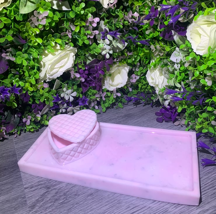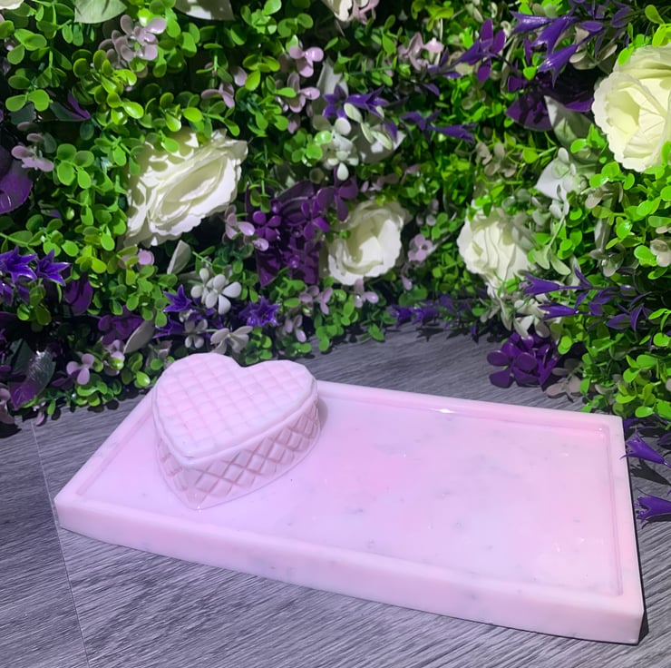 A handmade large rectangular tray and heart trinket pot in pink and silver flakes. Approximately 24.1cm x 12.1cm x 1.8cm in size, perfect for jewellery, keys, chocolates, you name it! Each piece is unique and comes gift-wrapped, perfect for gifting or treating yourself.
