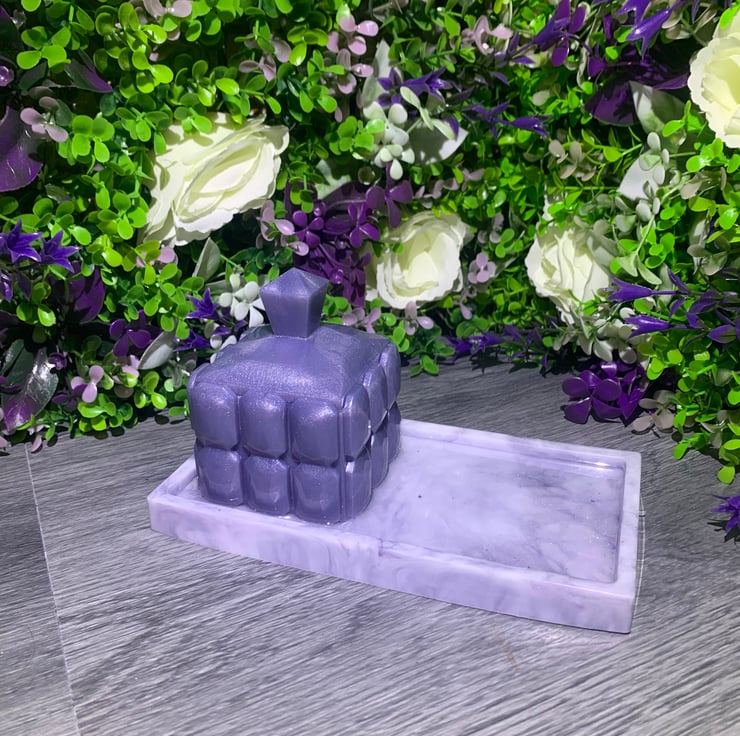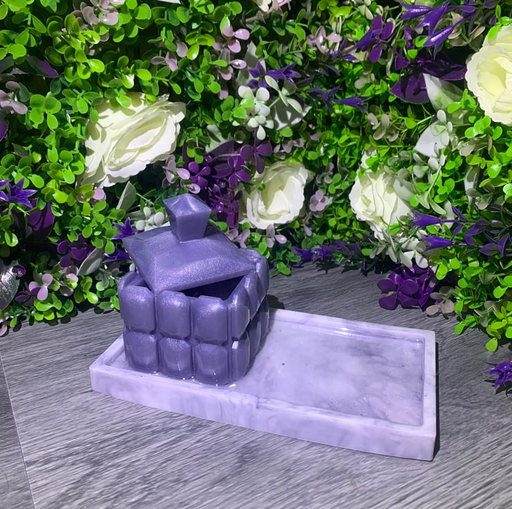 A handmade medium rectangular tray and ametria pot in purple and white. Approximately 18.1cm x 9.6cm x 10.1cm in size, perfect for jewellery, keys, chocolates, soap, you name it! Each piece is unique and comes gift-wrapped, perfect for gifting or treating yourself.
