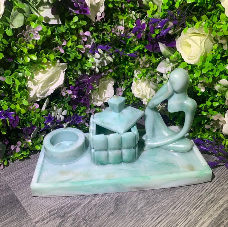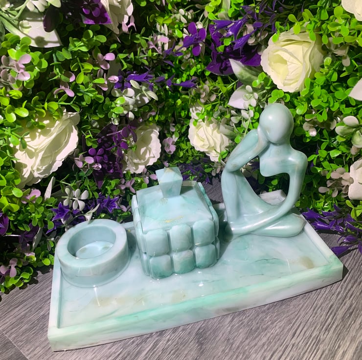 A handmade large rectangular tray, thinking person, round candle holder and ametria pot in green, green-gold and white. Approximately 24.1cm x 12.1cm x 14.8cm in size, perfect for jewellery, keys, chocolates, soap, you name it! Each piece is unique and comes gift-wrapped, perfect for gifting or treating yourself.
