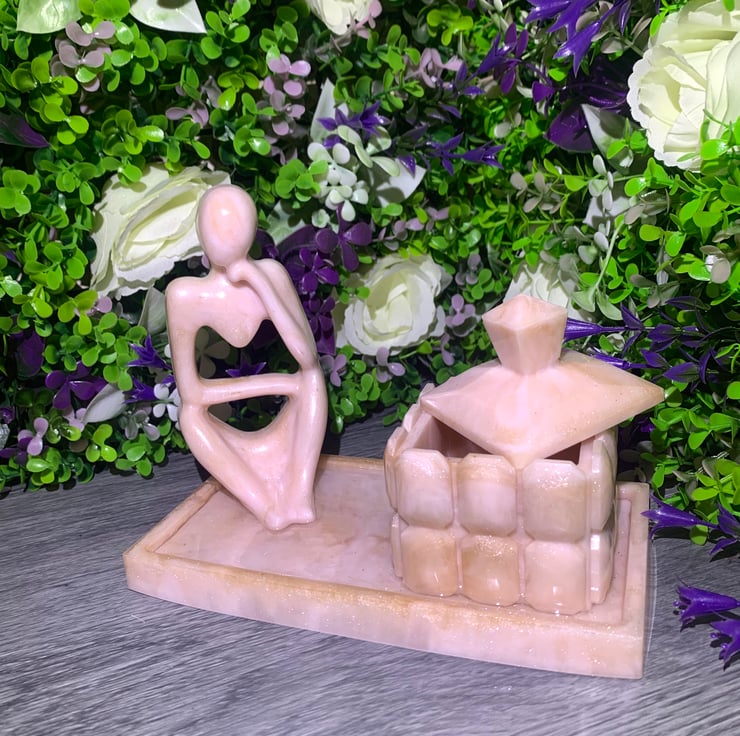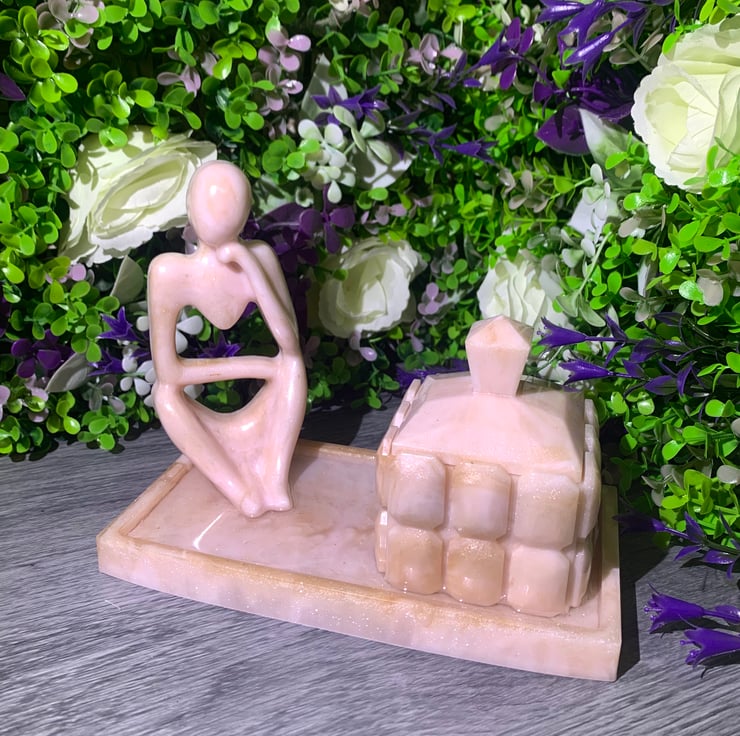 A handmade medium rectangular tray, ametria pot and thinking person in pink and gold marble. Approximately 18.1cm x 9.6cm x 13.6cm in size, perfect for jewellery, keys, chocolates, soap, you name it! Each piece is unique and comes gift-wrapped, perfect for gifting or treating yourself.