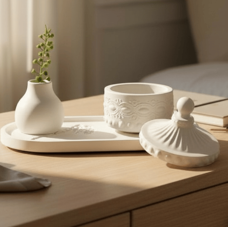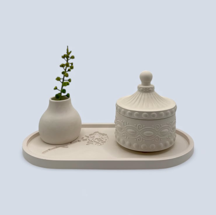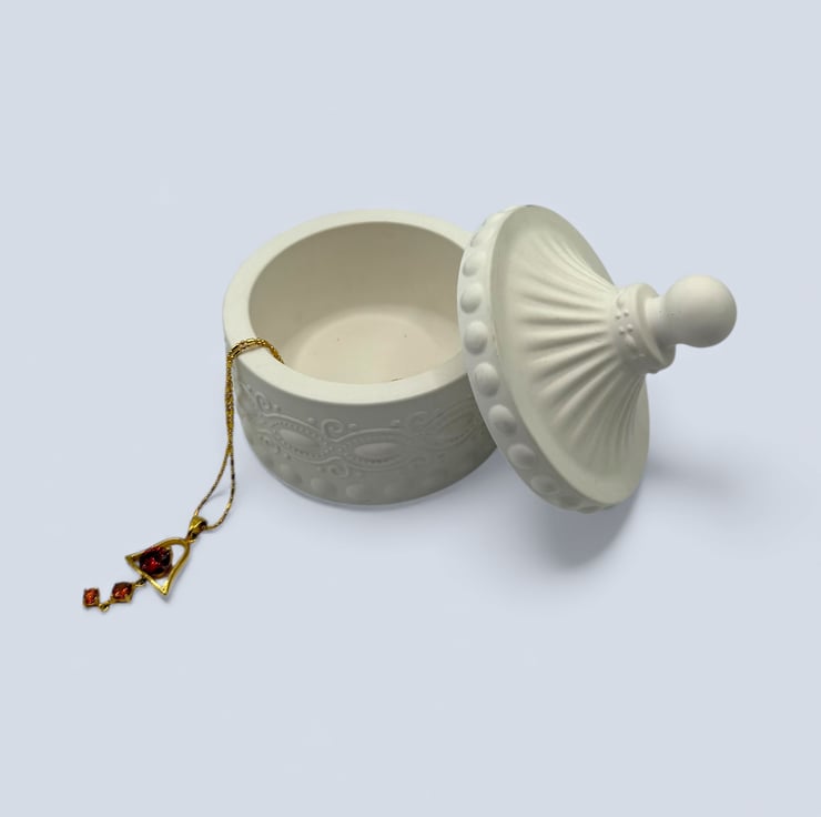 This white ornate jewellery box was inspired by a love of calm, timeless interiors and the quiet beauty of classic decorative details. I wanted to create a piece that feels gentle and elegant, something that sits comfortably in a space without demanding attention, yet still rewards a closer look with its delicate pattern and soft curves.