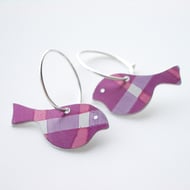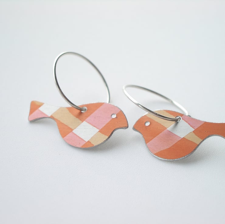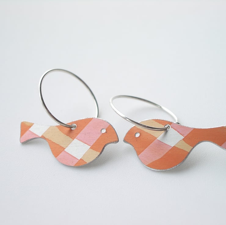 These bird earrings are made from anodised aluminium which I have dyed in ribbons of orange and yellow ochre which criss-cross each other to look like checks. I seal the dye in so that it becomes a permanent part of the metal and cut out the bird shape by hand with a piercing saw.