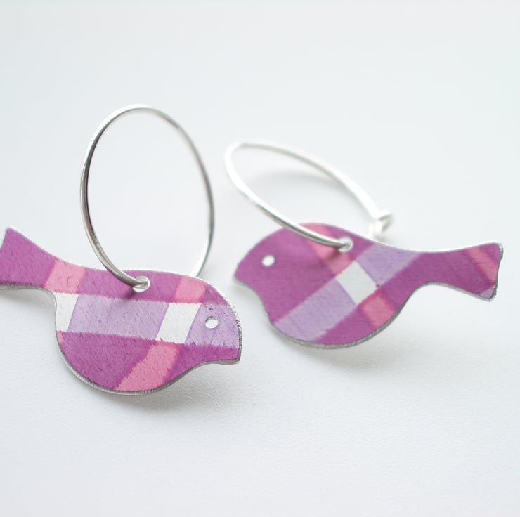 These bird earrings are made from anodised aluminium which I have dyed in ribbons of plum and raspberry pink which criss-cross each other to look like checks. I seal the dye in so that it becomes a permanent part of the metal and cut out the bird shape by hand with a piercing saw.