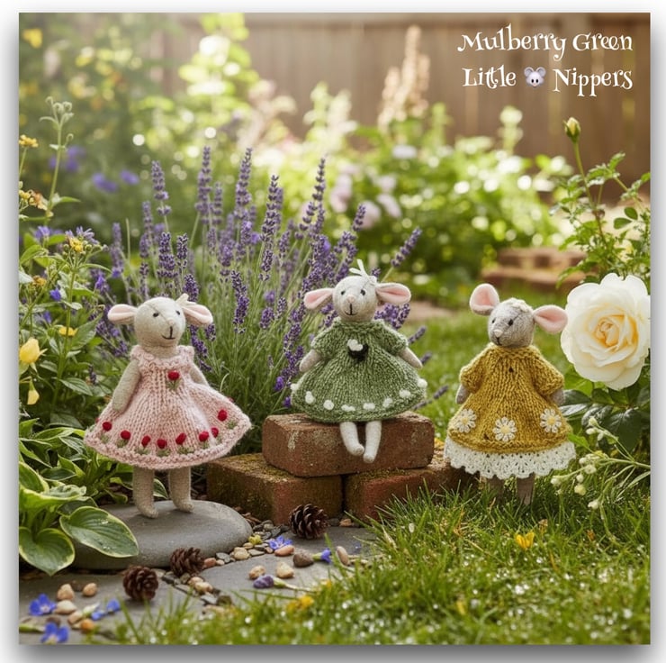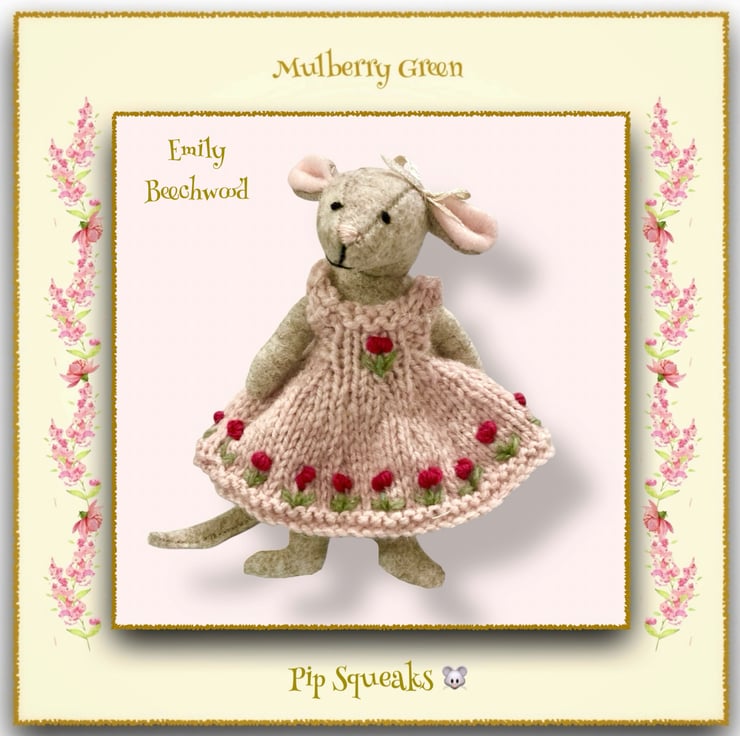 Emily Rosewood, in her knitted and embroidered pink dress, is a Pip Squeak, a young Little Nipper. Little Nippers are tiny wood mice who live in a maze of tunnels underneath the barn at Mulberry Farm. All of the Little Nippers are named after herbs and meadow flowers. Pip Squeaks are 11cm tall. Clothes made especially to fit them are also available in my shop.