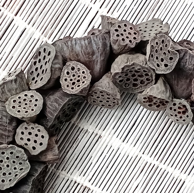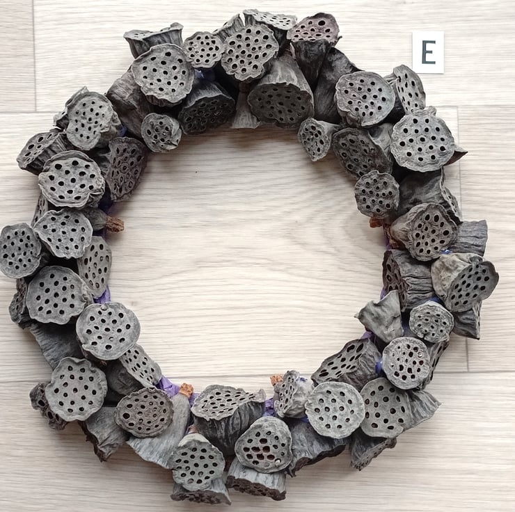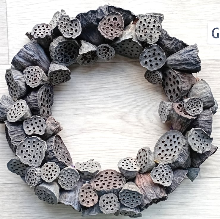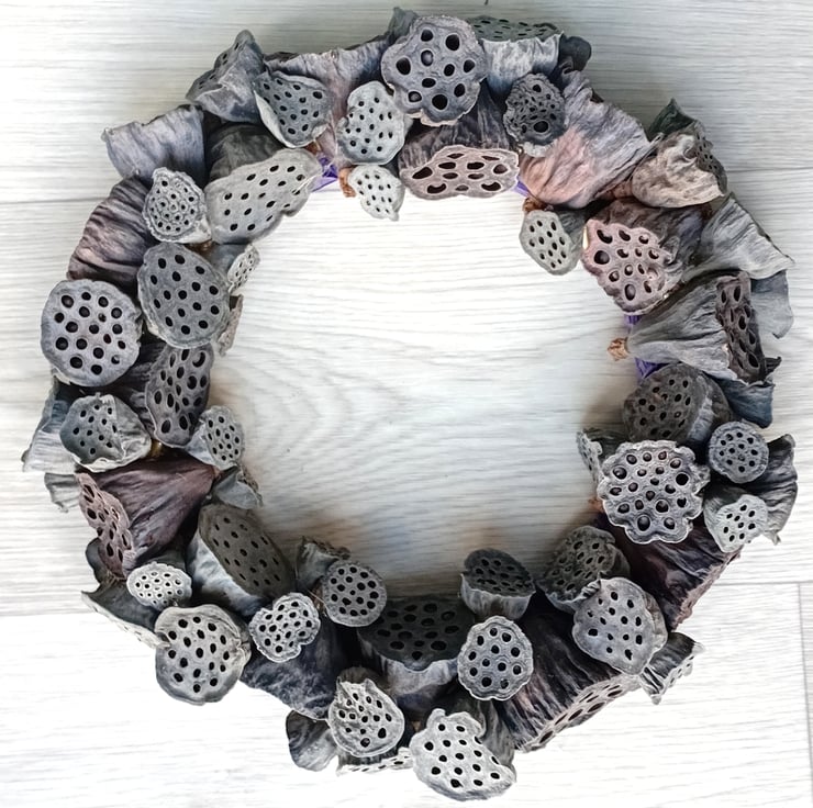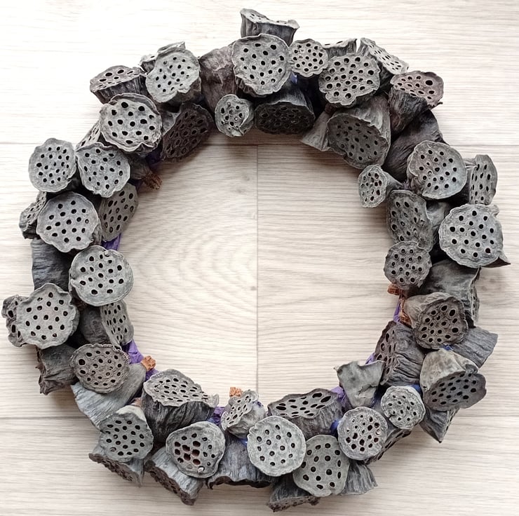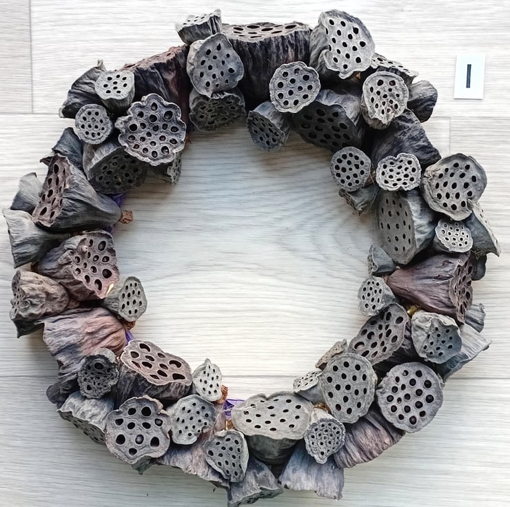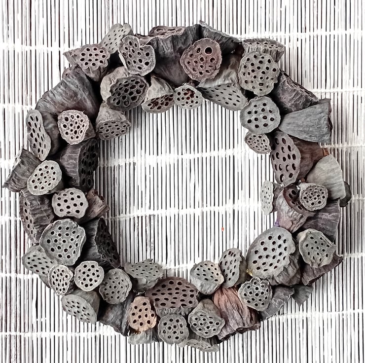 Contemporary MEDIUM 'ALL SEASONS' Wreath made from dried lotus flower seed pods. Pods are arranged randomly and secured to a wire and twine frame with 'hot' glue.
