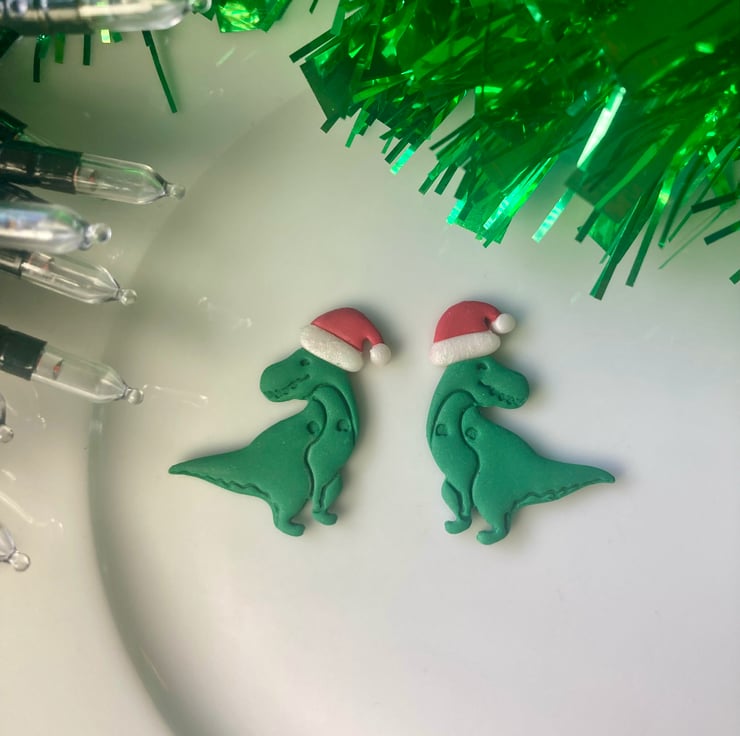 Roar into the festive season with these cheeky Christmas Dinosaur earrings! Crafted from vibrant green polymer clay, these adorable T-Rex studs bring prehistoric fun to your holiday look. Perfect for dino lovers and anyone who wants to add a splash of quirky charm to their celebrations. Lightweight and comfortable for all-day wear, they're the ultimate conversation starter this Christmas. Bite-sized style that packs a big personality punch!