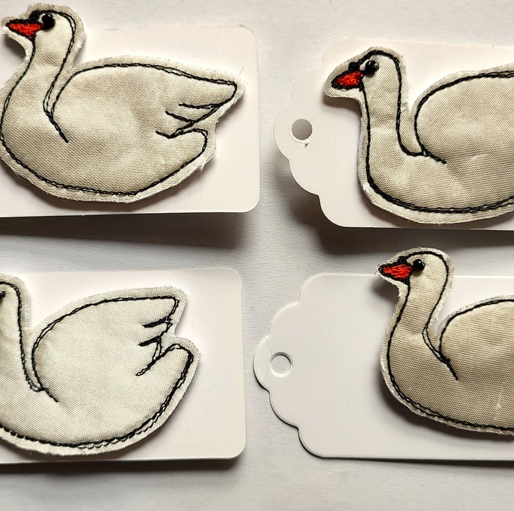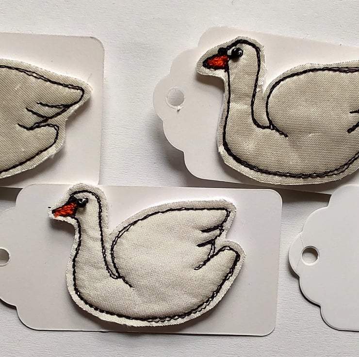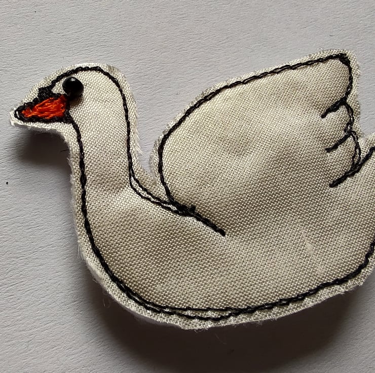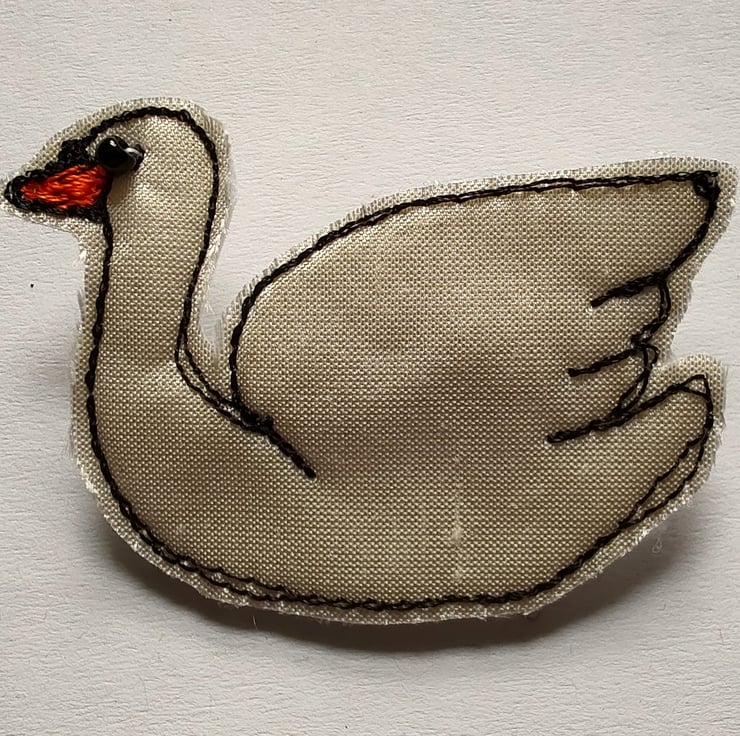 Using my trusty old Bernina sewing machine, each swan is free machine embroidered onto a layer of beautiful off white silk, embellished with embroidery and a beady black eye and backed with felt. Once I've added all the details a brooch back is hand sewn in place. Each one is unique and has it's own little character. They measure around 7 cm long.