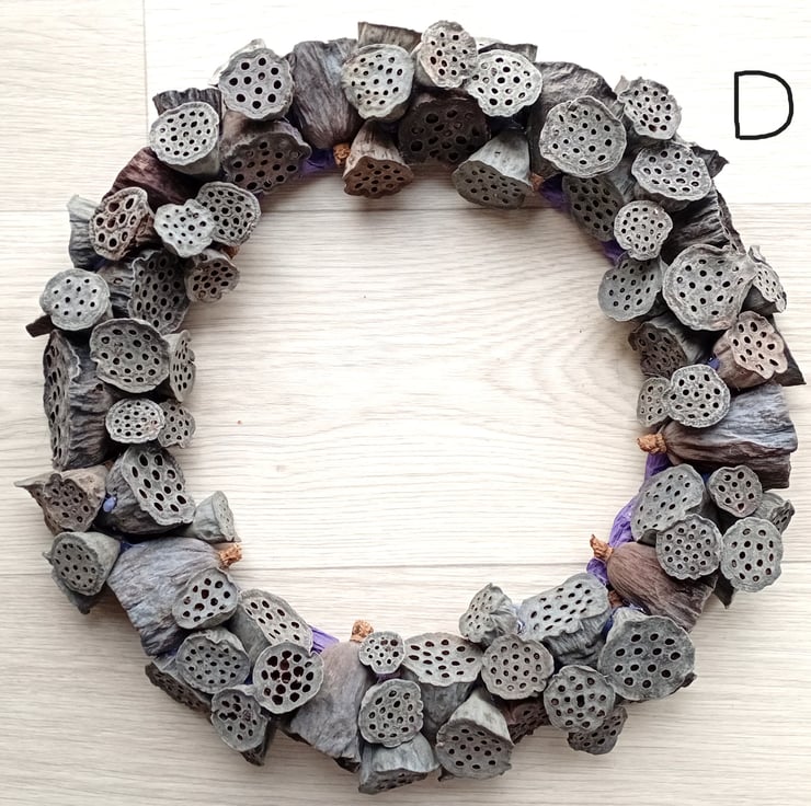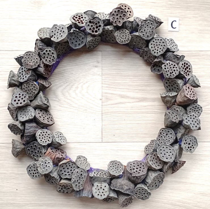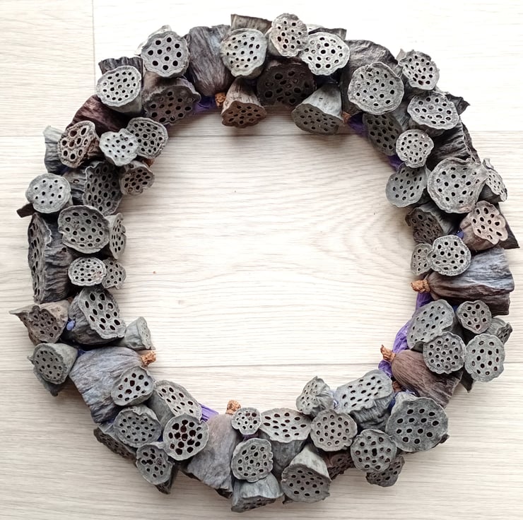 Contemporary LARGE 'ALL SEASONS' or simple, eco, natural Christmas Wreath made from dried lotus flower seed pods. Pods are arranged randomly and secured to a wire and twine frame with 'hot' glue.