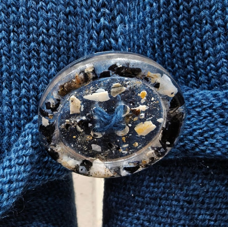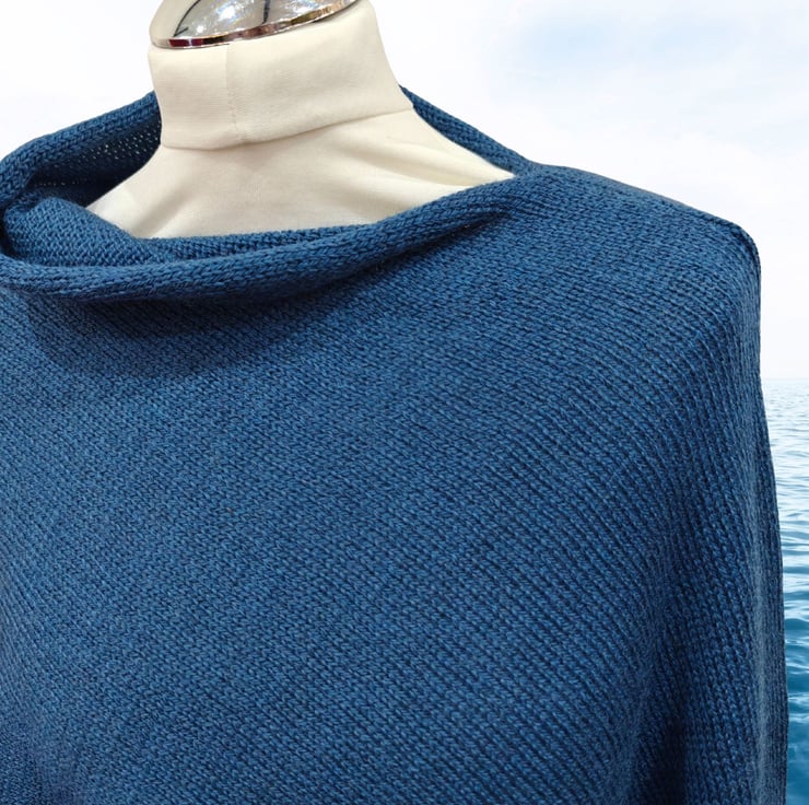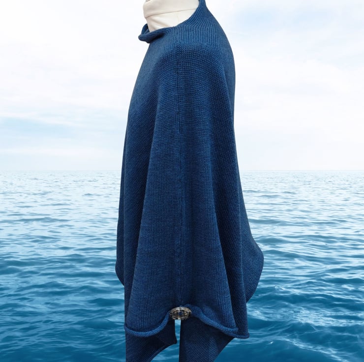 Wrap yourself up in this comfy merino wool poncho in a lovely sea blue. A larger size poncho to keep you warm in winter, perfect for layering. Decorated with one of my hand crafted buttons made from resin and mussel shells, this exquisite piece reflects the natural beauty that inspires all of my pieces. Individually created for you, it pairs seamlessly with my matching Contours beanie, cowl, and fingerless gloves. Discover the ultimate blend of elegance and warmth, crafted to elevate your winter wardrobe.