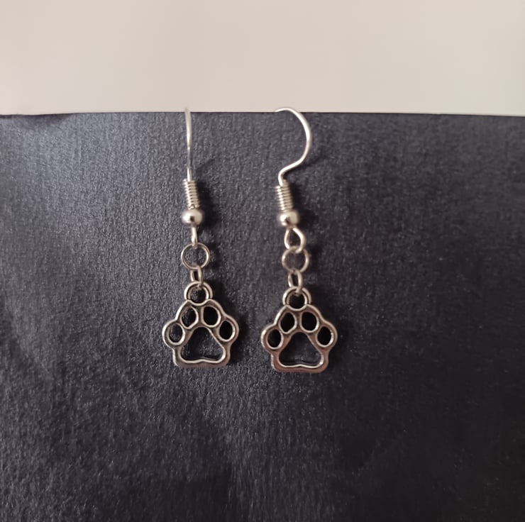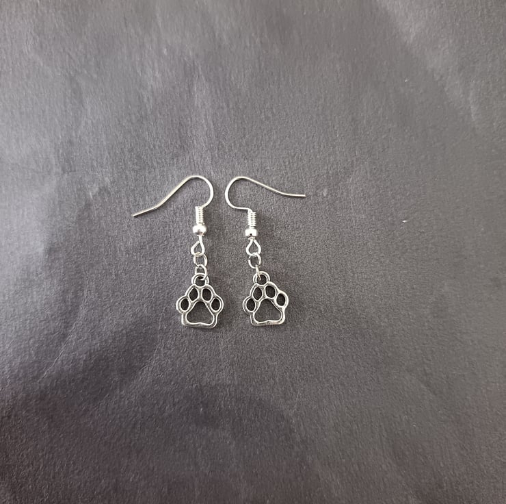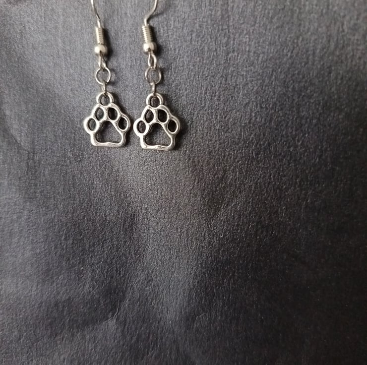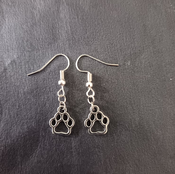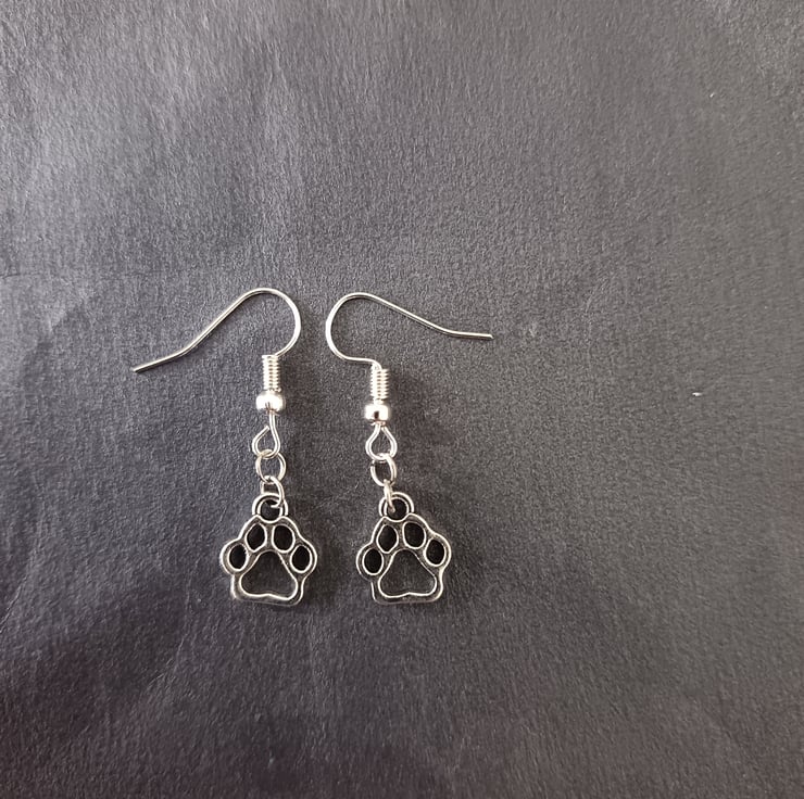 These handmade earrings are crafted with stainless steel hooks and stainless steel paw charms.