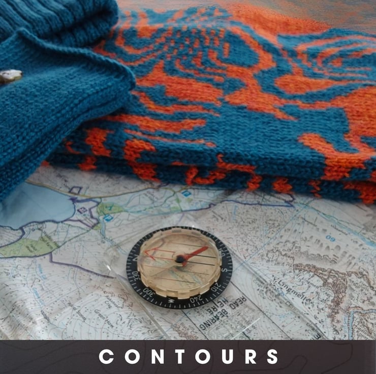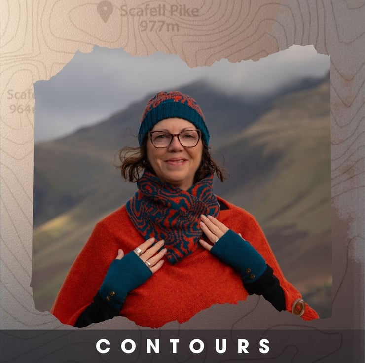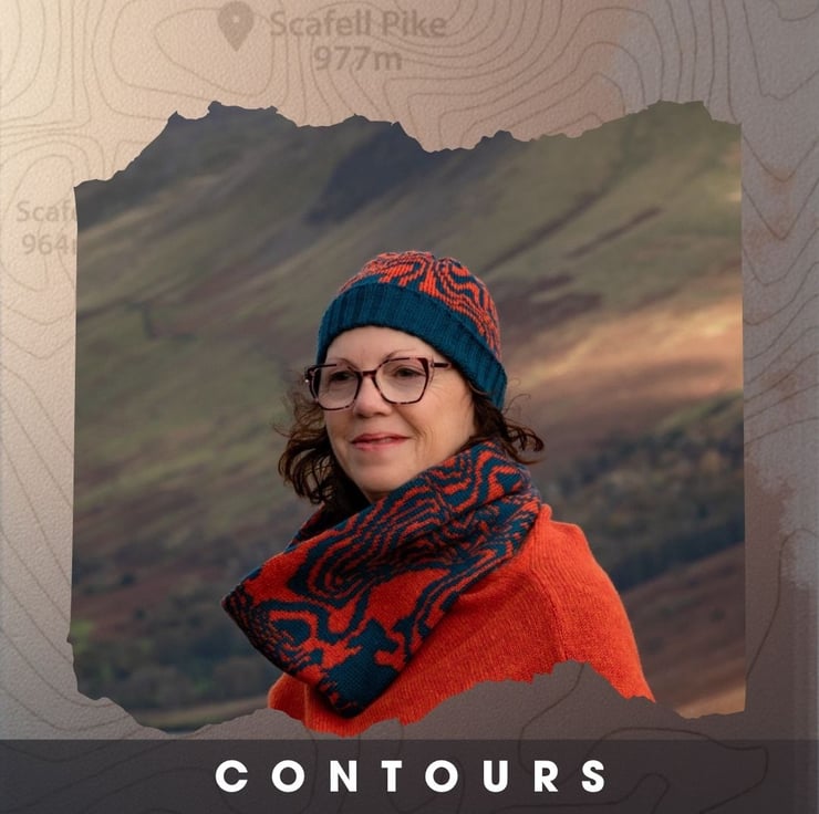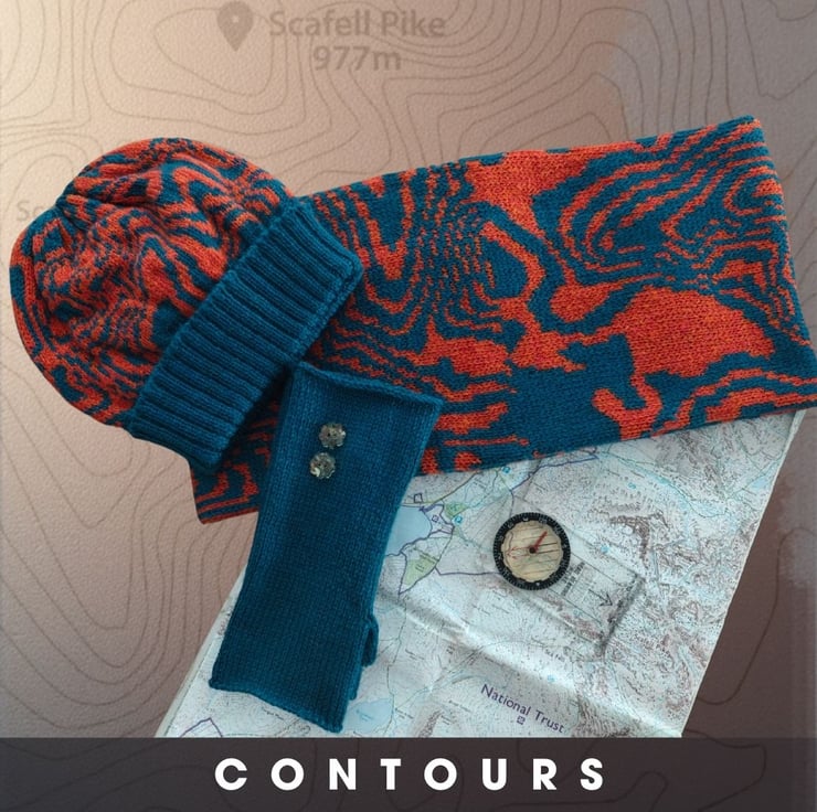 Contours Collection, a unique tribute to the beautiful contours found on walking maps. Inspired by my lifelong passion for exploring the fells and my shared love for maps with my husband, Mark Appleton Design, we collaborated to bring this vision to life. Mark crafted a stunning graphic of Scafell and Scafell Pike, while I dedicated weeks to perfecting a knitting pattern that complements his design. This collection is for all map enthusiasts and lovers of the Lake District fells.