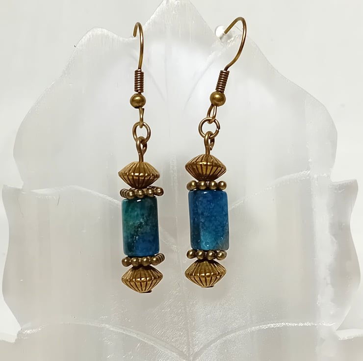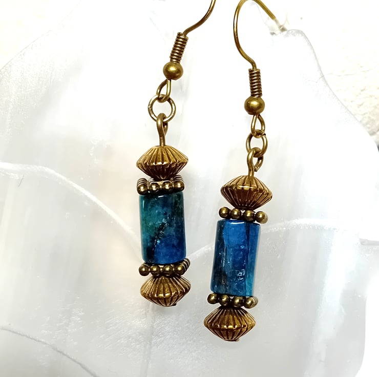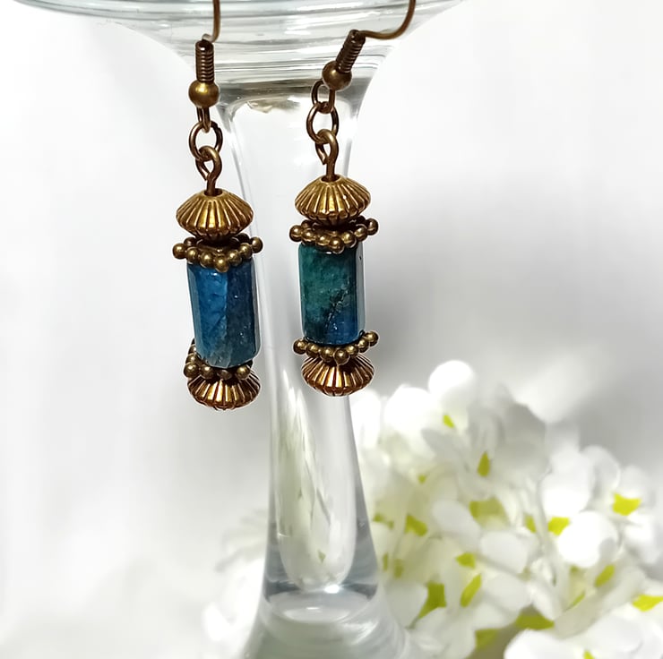 Gorgeous blue Apatite tube shaped with Bronze accents. These are set with Fish Hooks and come with silicone backs. You can choose a lever back by the drop down menu. They will come protectively wrapped for shipping.