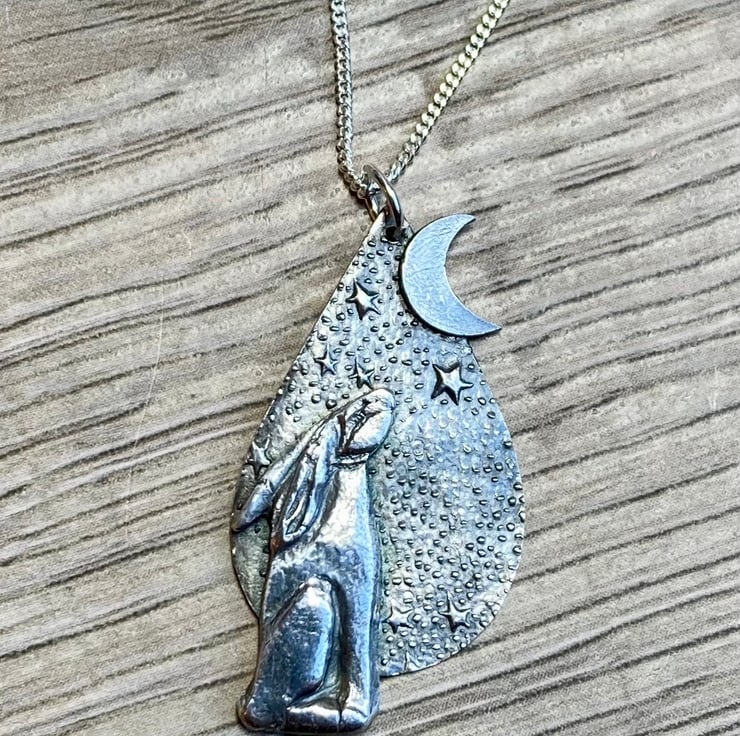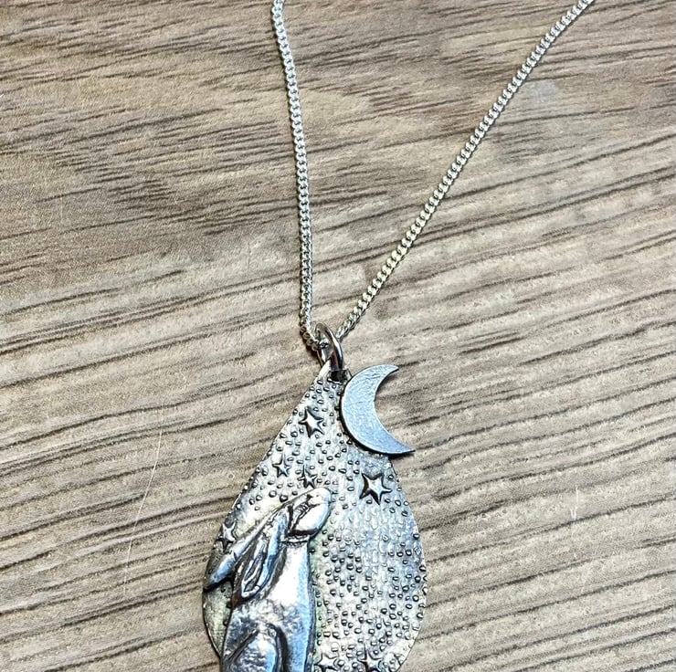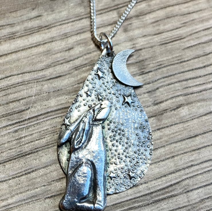 Pure silver hare gazing at a crescent moon. Individually hand made. On a sterling silver, 18” chain with an adjuster at 16”.