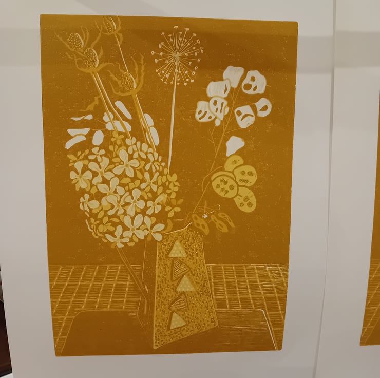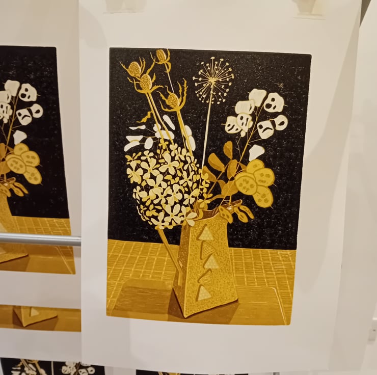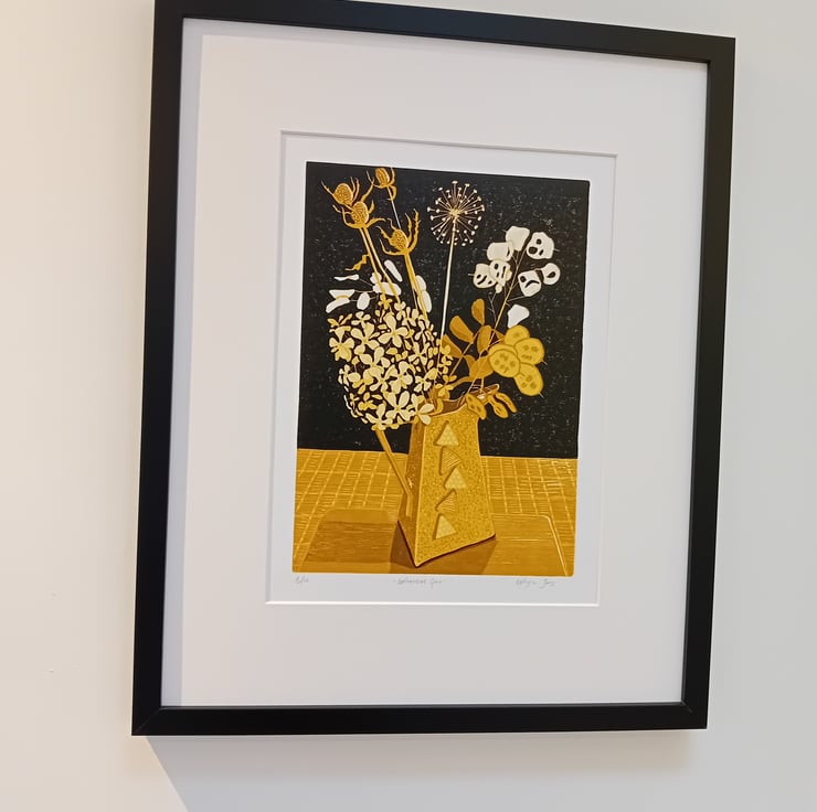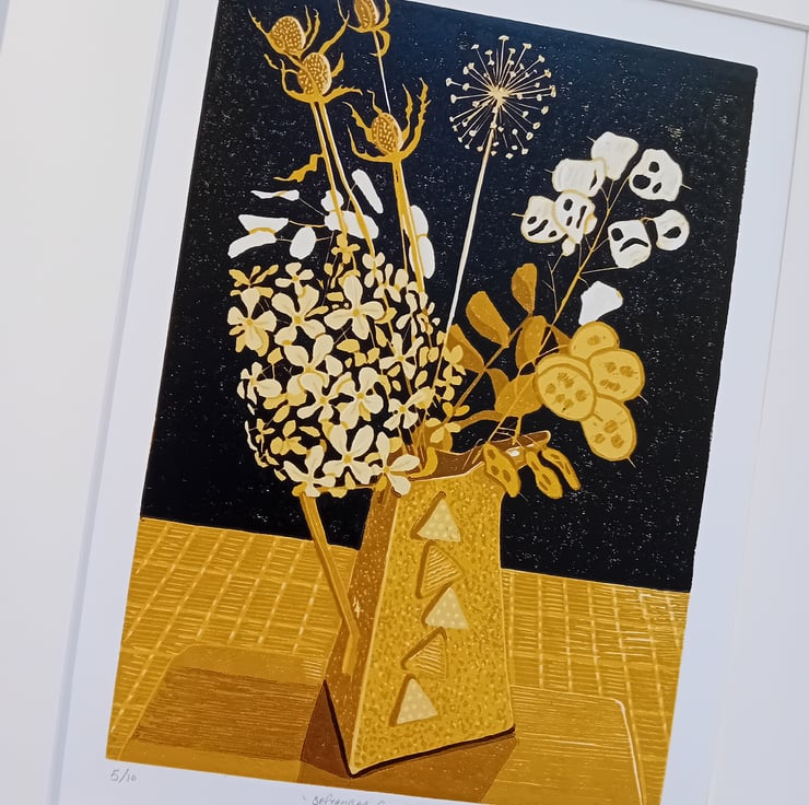 An original limited edition reduction linocut of autumn seedheads. Including Honesty, Hydrangea and Alium.