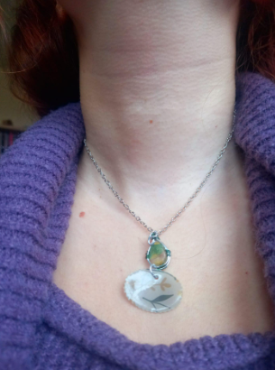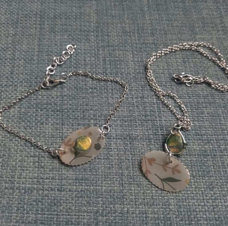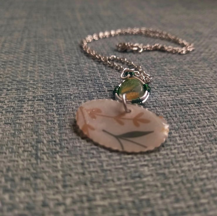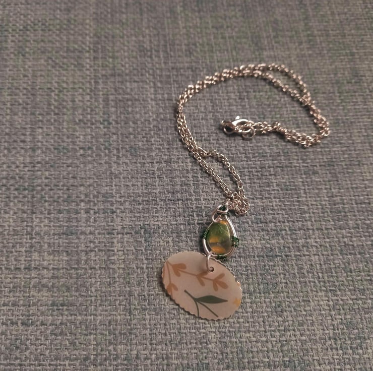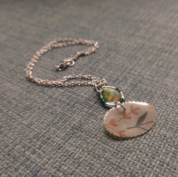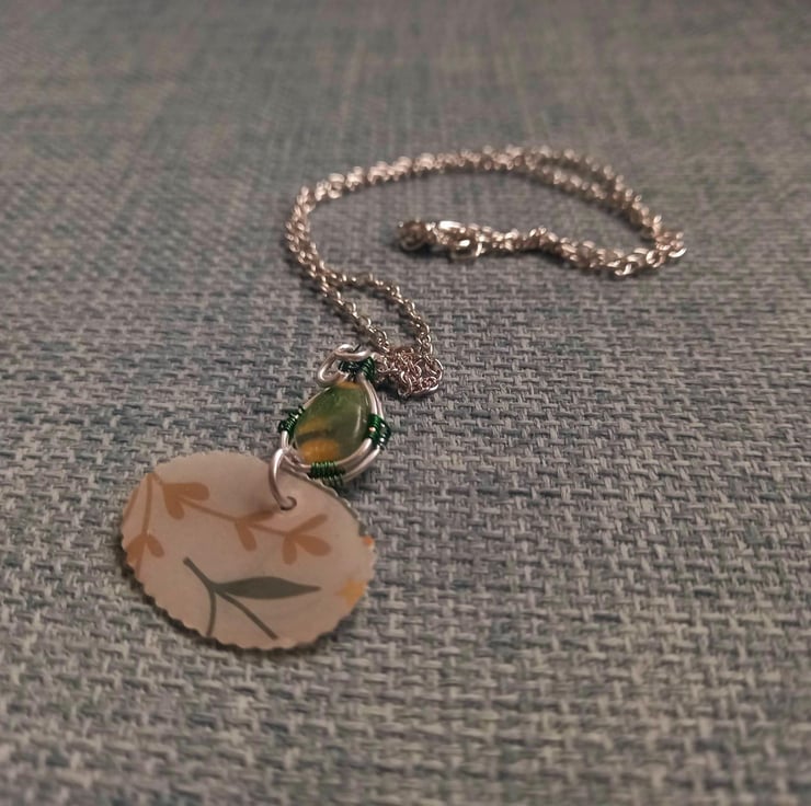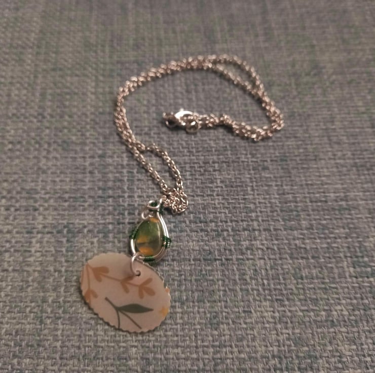These necklaces have been handmade with UV resin and card. The card is a pale green with brown and bronze leaves and have been cute into oval shapes. The resin gives them that shine and the gem alongside it is also made from resin. They hand from a stainless steel wire and chain.