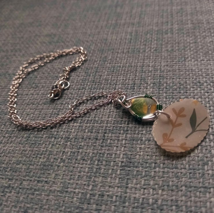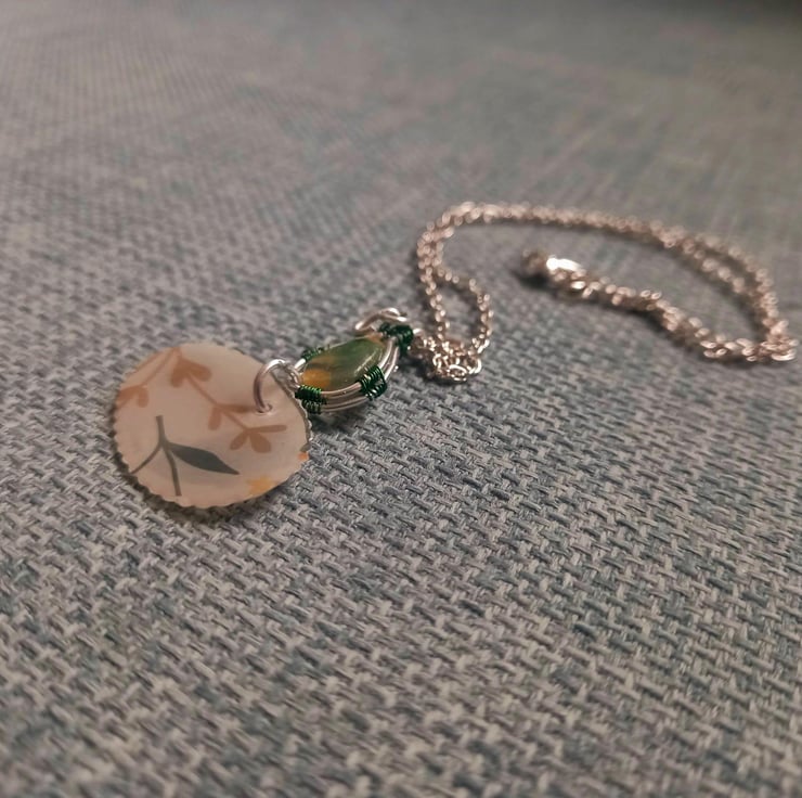 A matching necklace for a bracelet that was made earlier. I love the simplicity and the lightweight asthetic of this piece of jewellery. The leafy paper is a perfect match for the handmade resin gem that has been decorated in green and gold.
