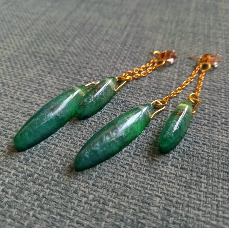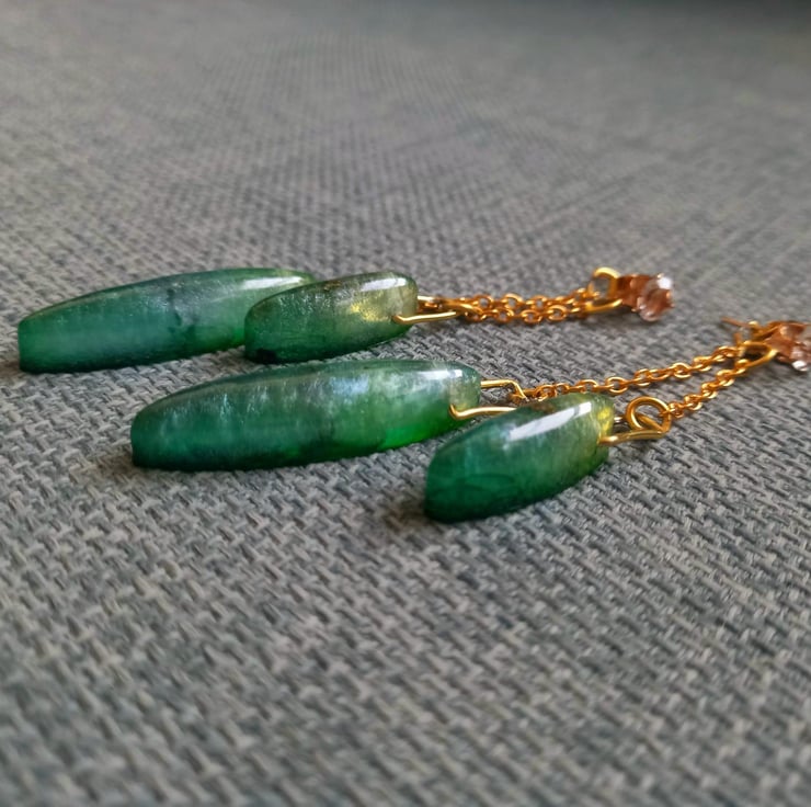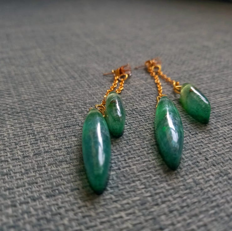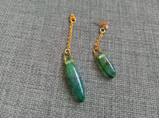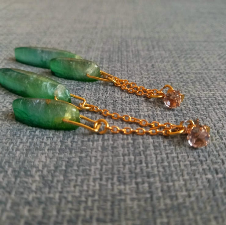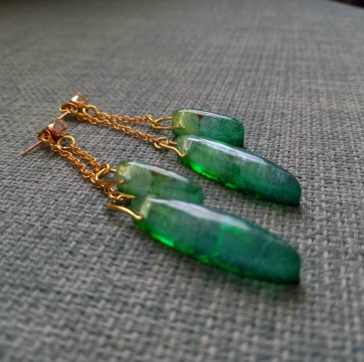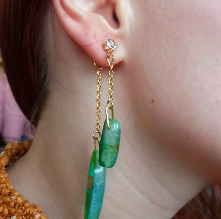 These earrings are handmade with epoxy resin and moulds. The colour is created with bright green and yellow alcohol inks and then some fluorescent green mica powder. They dangle front and back on copper diamonte studs and copper chain.